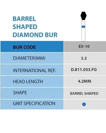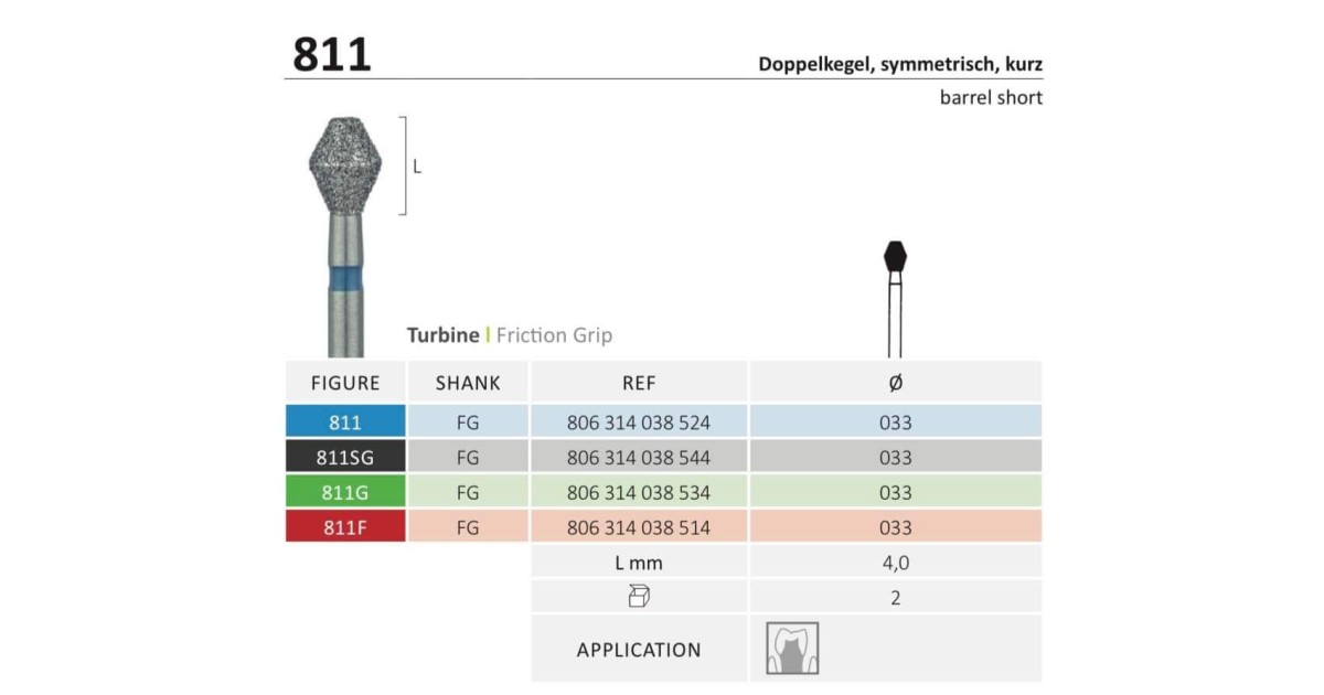 فرز الماسی مدل بشکهای توربین - Dental Diamond Burs Barrel 811:فرز الماسی کد 811 محصلولی ازکمپانی نام آشنای لاستردنتاست که فرزهای خود را بامتریال فرانسویروانه بازار کرده و از این رو این محصولات نسبت به سایر برندهای مشابه مزیت و برتری دارند.فرز کد 811 این برند با سه قطر متمایز033C، 037C و 31Cبا نوارسبز رنگکه معرف کارکرد آن (مخصوص تراش) است در بستههای 5 عددی در فروشگاه اینترنتی دندانت موجود است.