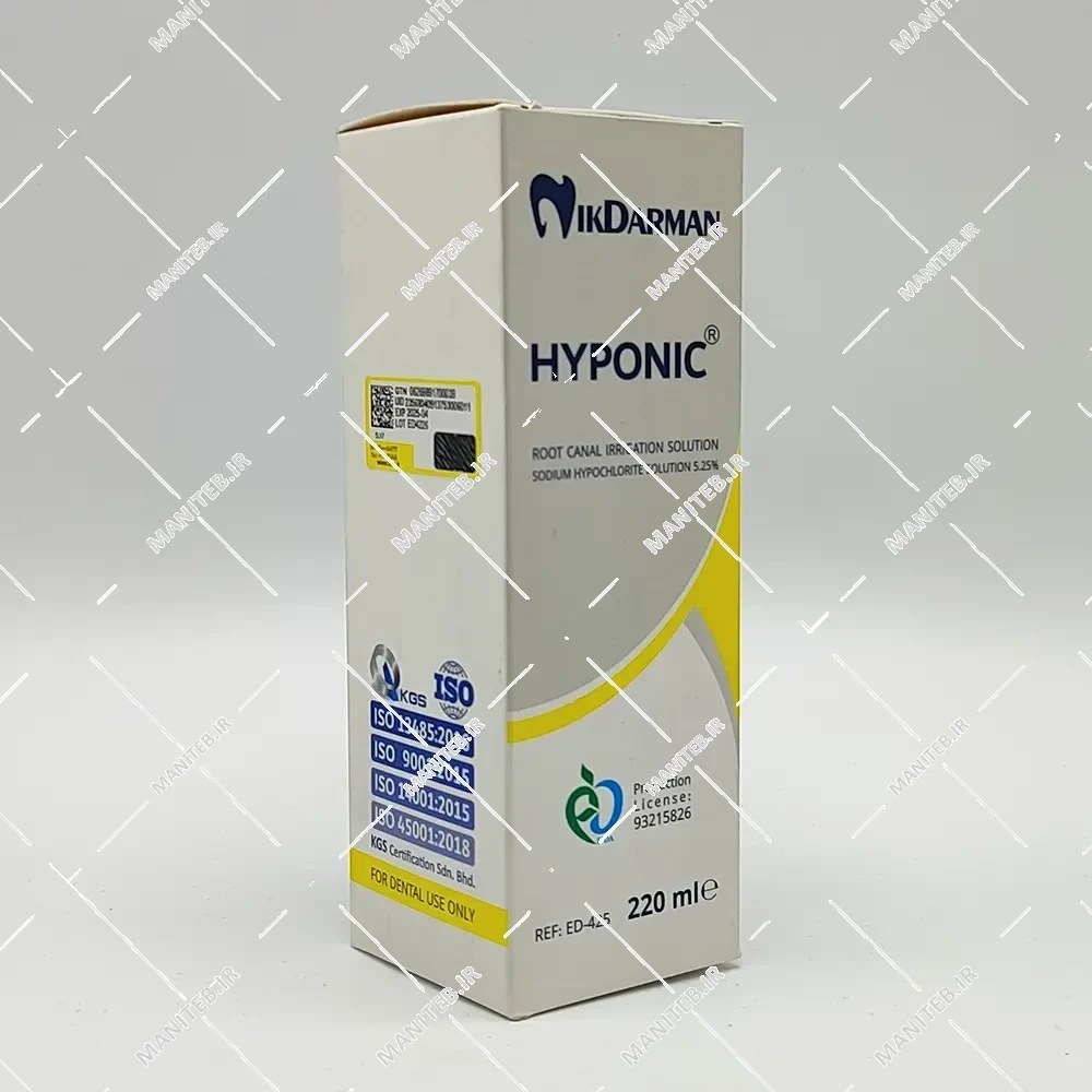 توضیحاتهیپونیک، محصولی موثر و به صرفه برای شستشو و ضدعفونی کردن کانال در درمان های اندو می باشد، و با حل کردن مواد آلی و حذف بقایای غیرزنده ریشه، ضمن آماده سازی کانال، می تواند از تغییر رنگ دندان نیز جلوگیری کند.موارد استفاده:شستشوی کانال ریشه و برداشتن لایه اسمیر، بافت مرده و کاهش موثر و قابل توجه میکروارگانیسم ها  (محصول روی اجزای غیر آلی لایه اسمیر تاثیری ندارد)ضد عفونی کردن کانال، موثر بر کاندیدا آلبیکانس و انتروکوک فکالیس و باکتری های گرم مثبتبازکردن توبول های عاجی قبل از فیلینگ.استفاده همزمان با کرم آرسی پرپ RC Glide به منظور آزادسازی اکسیژن (کف کردن) و پاکسازی و بازکردن کانالروش استفاده:مقدار کافی از محصول را با سرنگ در کانال تزریق کرده، و کانال را به مدت 30 ثانیه شستشو دهید، بدلیل تغییر خلوص هیپوکلریت پس از تماس با دیواره کانال، می توانید این کار را چند مرتبه انجام دهید.ترکیبات:هیپوکلریت سدیم، آب دیونیزه، پایدارکننده.
