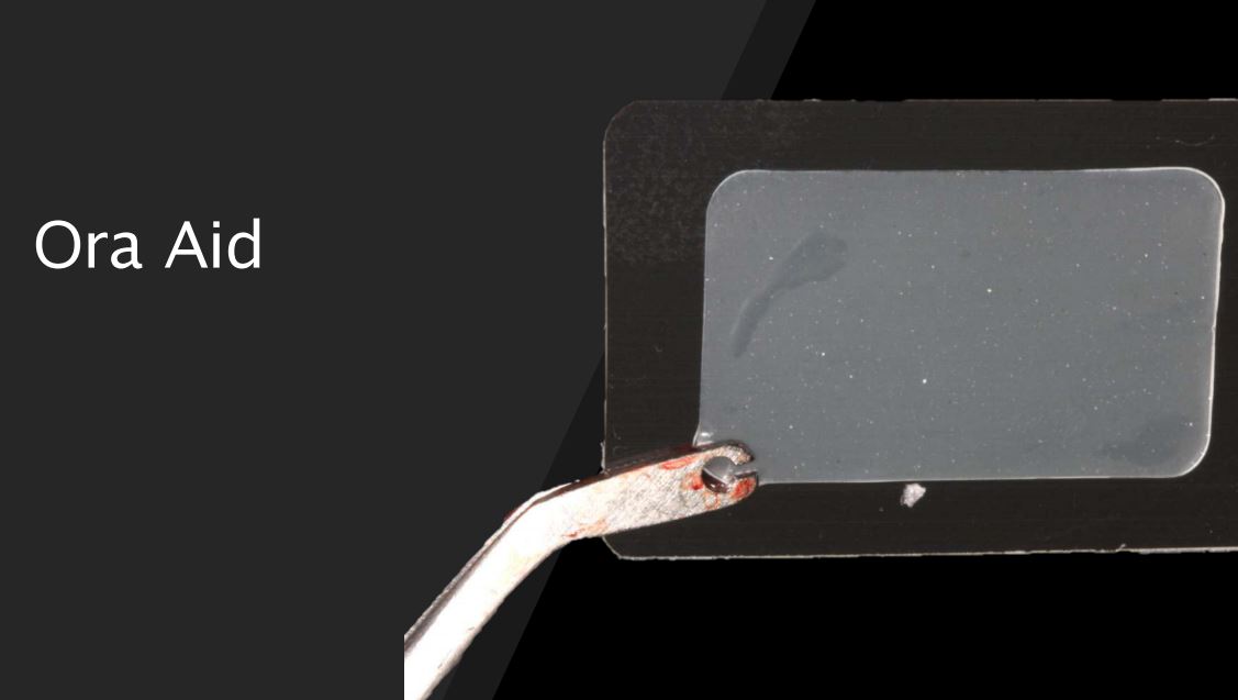 چسب داخل دهانی - Attachable Intraoral Wound Dressing:این محصول به منظور محافظت از زخمهای داخل دهانی در مقابل غذا، باکتری و دود سیگار و همچنیننواحی پس از جراحی (مانند بعد از کشیدن دندان عقل یا جراحیهای لثه) توسط کمپانی Ora-Aid تولید و عرضه شده است. از ویژگیهای حائز اهمیت آن میتوان به کاهش بوی بد دهان بوسیله داشتن طعم نعناع، محافظ زخمهای آفتی (زخمهای دهانی)، برش آسان به اشکال و اندازههای مختلف، چسبندگی مناسب با استفاده از پلیمر آبدوست (هیدروکسیاتیل سلولز)، محافظت از بخیه در برابر برخورد زبان، کاهش سوزش زخم، استفاده آسان و ایمن، کمک به هموستات و دارا بودن ویتامین E اشاره کرد.چسب داخل دهانی (Attachable Intraoral Wound Dressing) از برند Ora-Aid ساخت کرهجنوبی به صورت تک عددی در ابعاد 25*15 و 50*15 میلیمتر در فروشگاه اینترنتی دندانت عرضه میشود.