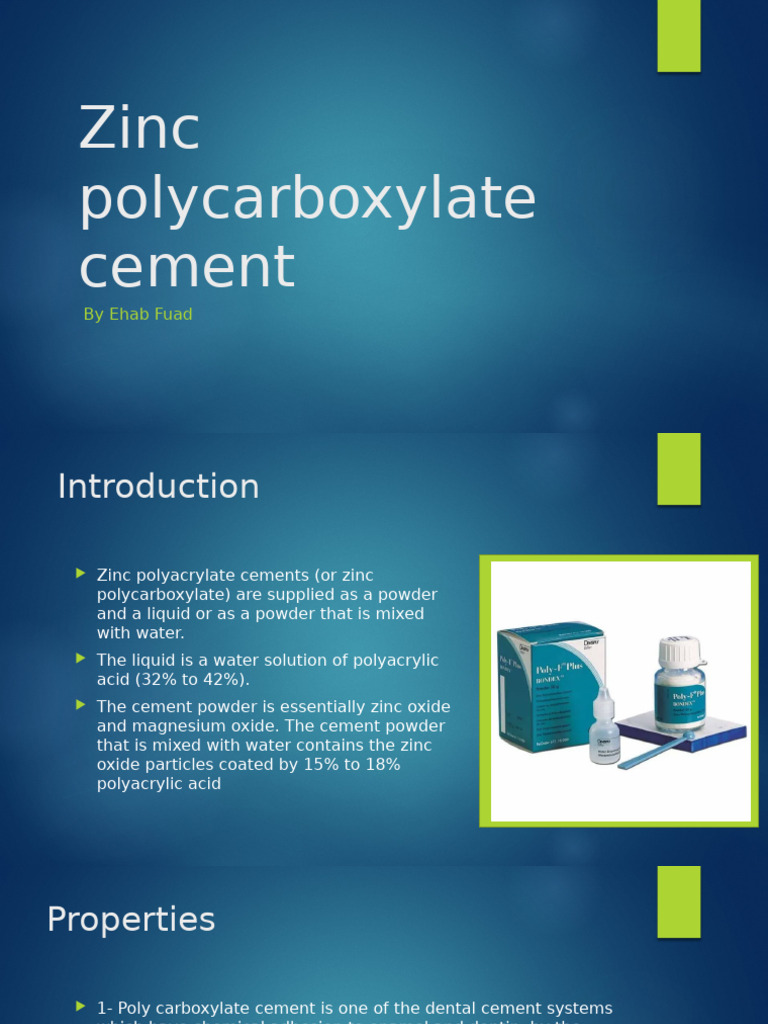 کاتالوگ محصولسمان پلی کربوکسیلات بزرگ – Polycarboxylate Cement:برای سمان کردن اینله، کراون، بریج، فیسینگ و براکتهای ارتودونسی کاربرد دارد. برای استفاده به عنوان عایق ایدهآل است.جهت کفبندی زیر مواد پرکردگی و چسباندن روکشهای استیل، پرکردگی موقت و پرکردگی دندانهای شیری استفاده میشود.حاوی زینک اکساید ، اکسید منیزیم و اسید پلی آکریلیک است.ضخامت کم آن درحد 13 – 18 میکرون میباشد.این محصول به صورت 80 گرم پودر و 40 میلیلیترمایع عرضه میگردد.اشتراک گذاری