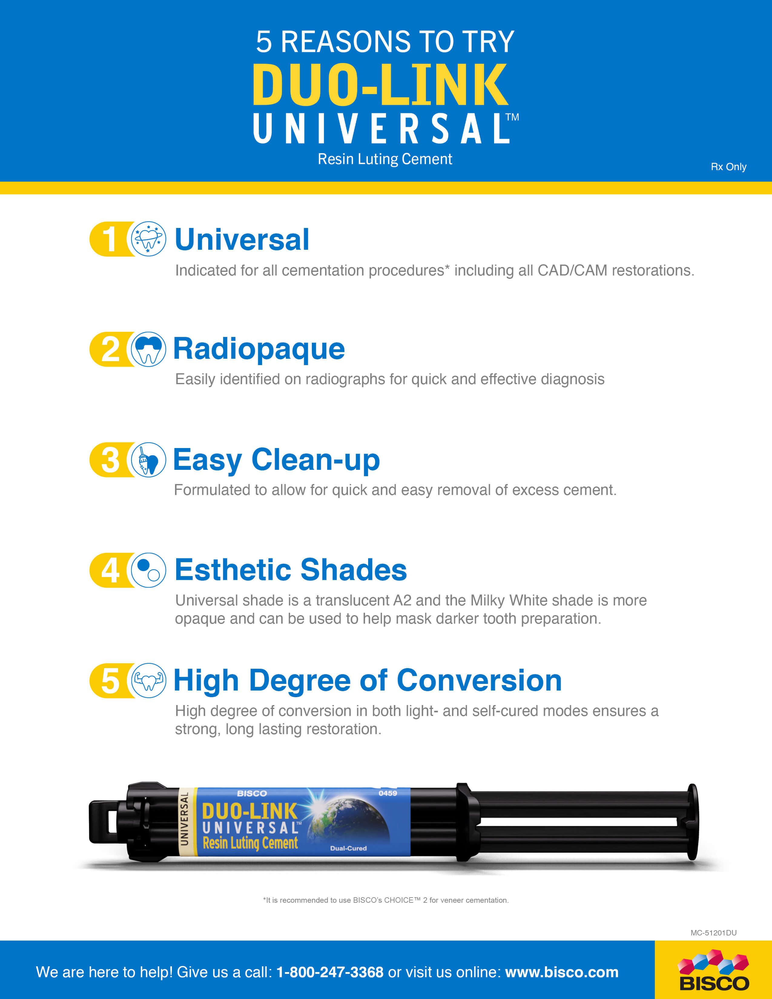 توضیحاتمعرفی سمان رزینی دوال کیور بیسکوسمانهای رزینی برای سمان کردن دائم پروتزهای ایمپلنت، کراون و بریج، اینله، بریجهای مریلند، ونیر، پست و پین، اسپلینتهای پریو و بندهای ارتودونسی کاربرد دارند. در این بینسمان دولینک بیسکوبا نامBisco Duo-Link Universalاز بهترین سمانهای رزینی موجود در بازار است که برای سمان کردن روکش های ایمپلنت و پروتز ثابت گزینهای ایدهآل محسوب میشود.ویژگیهای سمان دوال کیور بیسکوشاخصه مهم سمان دولینک بیسکو این است که هم بهصورت شیمیایی (خود به خود و در چند دقیقه) و هم با لایت کیور میشود. درواقع فرآیند پلیمریزیسایون در آن با تاباندن نور روی آن برای چند ثانیه آغاز شده و سپس به صورت خود به خود و با انفعالات شیمیایی ادامه پیدا میکند. این مشخصه سمان دولینک منجر به اتصال قوی و طولانی مدت سمان خواهد شد.از مزایای سمان دولینک بیسکو میتوان به یونیورسال بودن، رنگهای استتیک، ضخامت پایین، پاکسازی سریع و آسان و یونیورسال بودنش اشاره کرد.