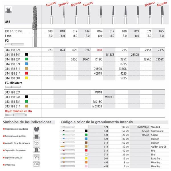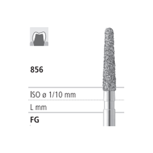 فرز الماسی مدل مخروطی ته گرد - Round End Taper 856:این فرز ازمتریال فرانسویساخته شده و رنگ سبز آن معرف کارکرد (مخصوص تراش) بودن آن است.فرز الماسی مدل مخروطی ته گرد کد 856 محصولی از کمپانی لاستردنت با متریال فرانسوی در قطرهای 012C و 014C و بستههای 5 عددی در فروشگاه اینترنتی دندانت عرضه میشود.