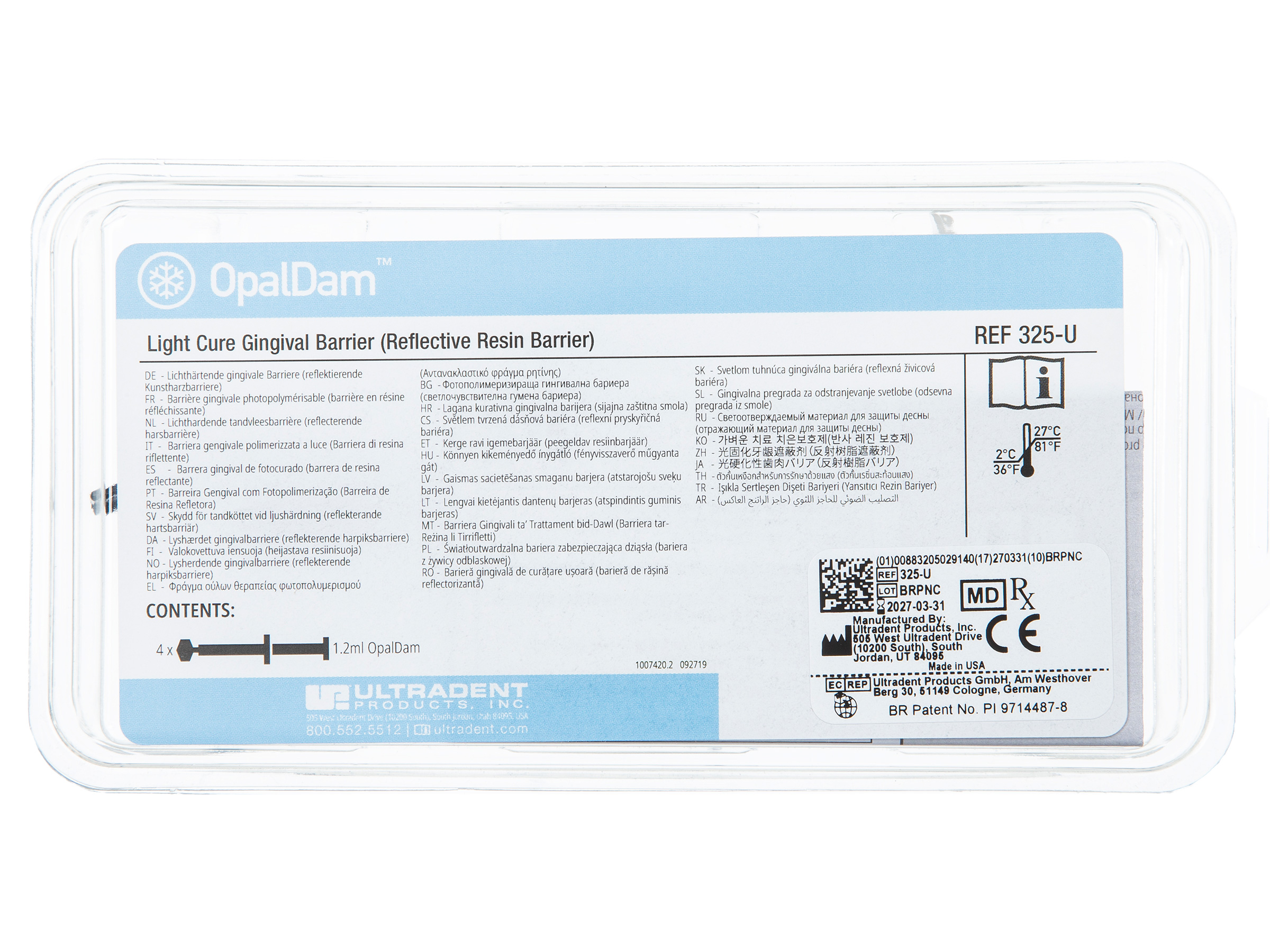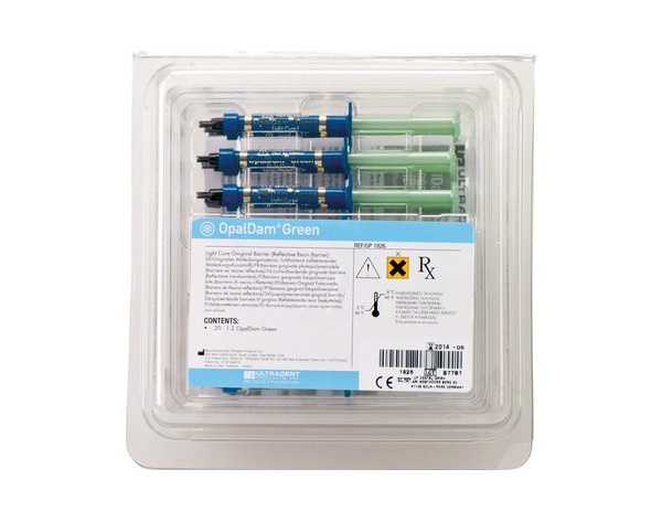 توضیحاترزين لايت كيور منحصر بهفرد با بيس متاكريلات جهت محافظت از نسوج لثه هنگام استفاده از:پرسلن اچ، هنگام ترميم پرسلن در داخل دهان و استفاده از مواد بلیچینگميكروابريژن (ايزوله كردن لثه و دندانهاي مجاور) و Power Bleachحفاظت از بافت نرم با ایجاد یک سیل غیر قابل نفوذبرداشت آساناستفاده مستقیمرنگ سبز و سطح براق و منعکس کنندهرزین رابردم اولترادنت یک نوع رزین با بیس متاکریلات میباشد که نقش لایه محافظت کننده برای ایزولاسیون بافت نرم کنار دندانی که تحت درمان بلیچینگ است، بازی میکند. opaldam از دندانهای مجاور محافظت میکند، زمانی که دندانپزشک تک دندان را سفید میکند. این محصول به طور کامل نور را منعکس میکند تا حرارت و حساسیت ناشی از کیورینگ را کاهش دهد. Opaldam یک سد عاری از خطا در زمان بلیچینگ در مطب دندانپزشکی میباشد.