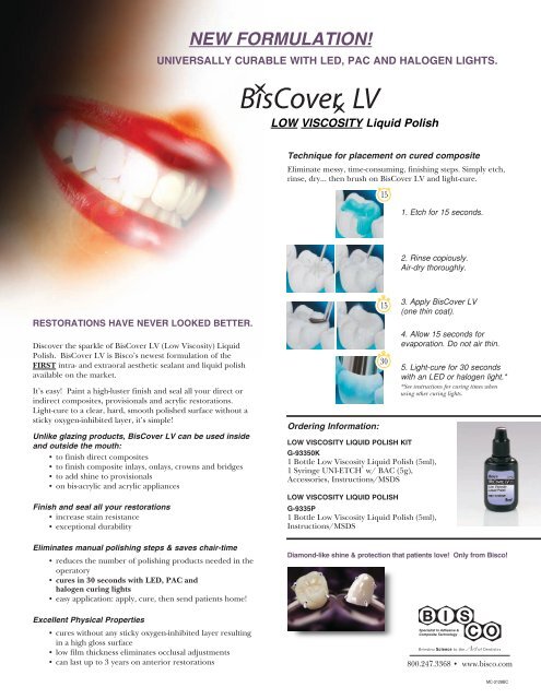 معرفی بیسکاور بیسکومایع پالیش (گلیز) یا بیسکاور را در دندانپزشکی معمولا برای ترمیمهای کامپوزیتی استفاده میکنند. در ترمیمهای کامپوزیتی، نیاز به پرداخت یا پالیش پس از پایان کار داریم.این پرداخت به همراه مایع پالیش یا بیسکاور هم به صاف و براق شدن سطح کمک میکند و هممانع از نفوذ میکرولب به درون بافت ترمیمی میشود. بیسکاور بیسکو یکی از بهترینهای موجود در بازار است.ویژگیهای مایع پالیش بیسکوبیسکاور بیسکو یا مایع پالیش بیسکو، بر پایه رزین بوده و لایت کیور است.این مایع کمک میکند تا سرعت کار پالیش و پرداخت سطح کامپوزیت بیشتر شده و نتیجه کار نیز رضایتبخشتر باشد.ویسکوزیته مایع پالیش بیسکو پایین است و سطح کامپوزیت را از هر گونه خراش میکروسکپی که میتواند محل نفوذ میکروبها باشد پوشش میدهد.بیسکاور بیسکو همچنین مقاومت کامپوزیت را نسبت به تغییر رنگ و سایش افزایش میدهد و در کلیه ترمیمهای مستقیم و غیر مستقیم کامپوزیت در داخل و خارج از دهان قابل استفاده است.Film Thickness = 10 µmصرفهجویی در زمان با حذف مرحله پالیش به روش معموللایتکیورGloss = 93 GUHardness = 55Wear (Toothbrush) = 2 µm/year