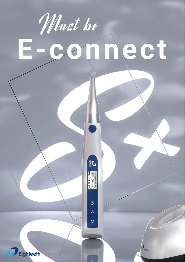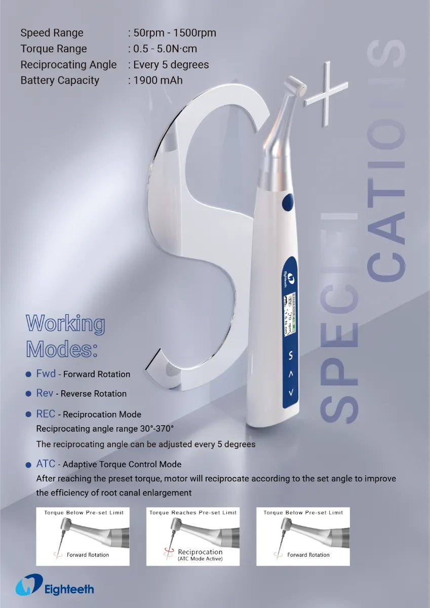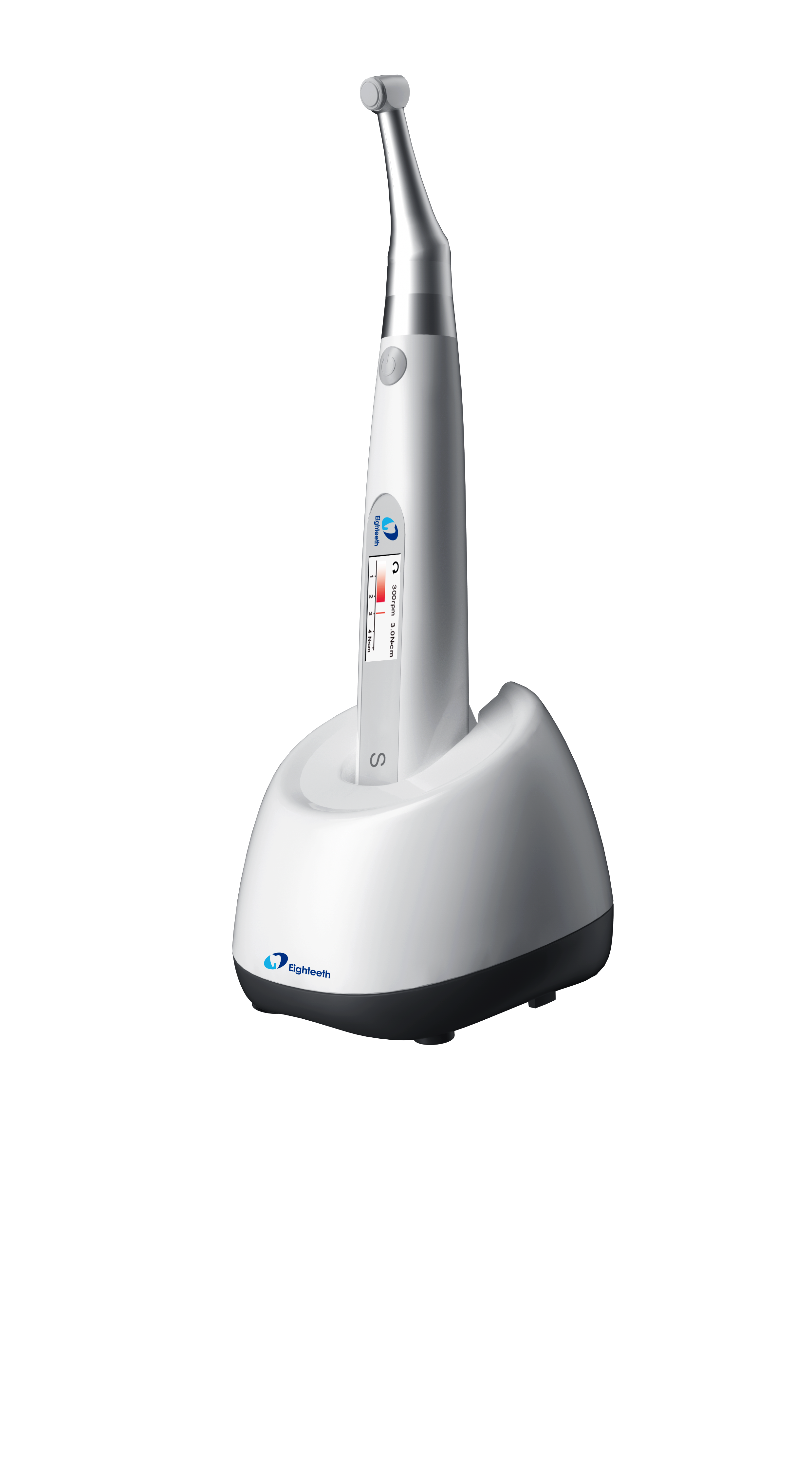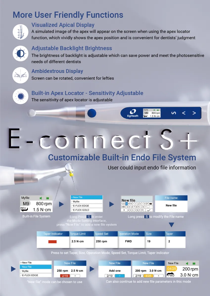 توضیحاتاندو موتور E-Connect Sاندو موتور هوشمند همراه با اپکس لوکیتور داخلی با قابلیت چرخش فایل به صورت رسیپروک ( Reciprocate ).گزینه های موجود در اندوموتورهای E-Connect S (همراه با اپکس لوکیتور داخلی) :Apical Action که شامل موارد زیر می باشد:۱.Apical Reverse:کاربر می تواند با فعال نمودن تنظیمات ریورس دستگاه، تعیین کند که هنگامیکه فایل به محدوده اپیکالی رسید، پایین تر نرفته و در جهت معکوس حرکت کند.۲.Apical Slow Down:کاهش سرعت حرکت فایل هنگام نزدیک شدن به محدوده اپکس.۳.Apical Stop:توقف فایل هنگام رسیدن به اپکس در حالی که دستگاه روشن می باشد.۴.Apical Off:توقف فایل هنگام رسیدن به اپکس به همراه خاموش شدن دستگاه.Orifice Action که شامل موارد زیر می باشد:AutoStart&Stop:با ورود فایل به اوریفیس کانال ریشه ، موتور شروع به حرکت می کند و پس از بیرون آمدن، متوقف می گردد.دارای ۴ حالت چرخشی می باشد:۱.حالت forward۲.حالت Reverse۳. حالت Reciprocate (رفت و برگشت):در این حالت، قابلیت تنظیم زاویه از ۰ تا ۳۷۰ درجه وجود دارد۴. حالت ATC:قابلیت تنظیم زاویه به صورت رسیپروکیت از ۰ تا ۳۷۰ درجه(رفت و برگشت) + تنظیم تورکویژگی های اپکس فایندر و روتاریEighteethمدل: E Connect Sطراحی زیبا و ارگونومیکصفحه نمایش LCDدارای تکنیک اندازه گیری چند فرکانسیدارای سیستم آلارم اندازه گیریدقت اندازه گیری ۰٫۱ میلیمتردرصد خطای کمتر از ۵ درصددارای کالیبراسیون خودکاردارای پروب و آنگل با قابلیت استفاده در اتوکلاوامکان کار در محیط های خشک، مرطوب، خون و عفونتسرعت چرخش قابل تنظیم از ۱۲۰ تا ۱۰۰۰ دور در دقیقهگشتاور(تورک) قابل تنظیم از ۰٫۵ تا ۴ نیوتن بر سانتیمترضریب گشتاور ۱ به ۱دارای کنترل اتوماتیک سرعت و گشتاوراستاندارد CE اروپا، ISO