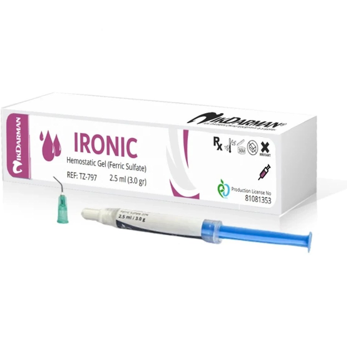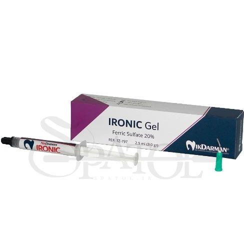 توضیحاتمعرفی:آیرونیک عامل منعقد کننده خون حاوی فریک سولفات است. این محصول در یک بستر ویسکوز بی اثر و محلول در آب است. PH این محصول با فرمولاسیون انحصاری شرکت نیک درمان، در حدود یک بوده، لذا محصول حاوی معرف هایی ویژه به منظور تلطیف عملکرد و محافظت از بافت های سخت و نرم دهان هستند. در مقایسه با خونبند های بر پایه کلرید آلومینیوم، آیرونیک تنها ظرف چند ثانیه خونریزی را کاهش می دهد، و جهت ایجاد باندینگ بهینه، آلودگی ناشی از مایعات سالکولار را از بین می برد.ترکیبات:فریک سولفات، حامل پایه آب، ضدحساسیت، بافر و تلغیظ کنندهموارد مصرف:جهت انعقاد خونریزی سطحی مویرگ ها در جراحی های دهان و دندان:1. جراحی پروتز های دندانی ثابت، جراحی ترمیمی، درمان پریودنتال و …2. رتروفیلینگ، برش لثه3. درمان های پالپوتومی