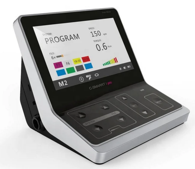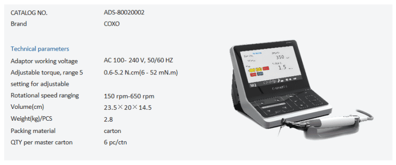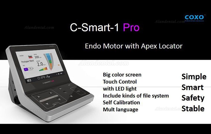 توضیحاتاپکس روتاری کوکسو مدل C SMART PROدقت اندازه گیری: 0.1 میلیمتردارای کالیبراسیون خودکارروتاری نوری (Optic)تکنیک اندازهگیری چند فرکانسیسیستم آلارم اندازهگیری اشتباهدقت اندازهگیری ۰.۱ میلیمترضریب گشتاور ۱۶:۱کالیبراسیون خودکارسرعت چرخش قابل تنظیم از ۱۵۰ تا ۶۵۰ دور در دقیقهگشتاور (تورک) قابل تنظیم از ۰.۶ تا ۴ نیوتن بر سانتیمترتوانایی کار در محیطهای خشک، مرطوب، مملو از آرسی پرپ، خون و عفونتکنترل اتوماتیک سرعت و گشتاورعملکرد تماما اتوماتیک Auto start & Stopدارای پروب و آنگل اتوکلاو ابلقابلیت برگشت خودکاردارای کالیبراسیون خودکار و پروب اتوکلاوابلباطری دستگاه به صورت لیتیوم یون شارژی می باشد. همچنین وزن دستگاه 2.8 کیلو گرم و در کنار این موارد باید گفته شود که ابعاد دستگاه به میزان 325*200*145mm می باشد. تغذیه و توان دستگاه نیز به صورت AC100-240 V,50-60 HZ می باشد.پکس روتاری کوکسو C SMART I PROدارای یک LCD رنگی بزرگ میباشد که تمام اطلاعات در حین کار در این صفحه قابل مشاهده است. از دیگر مشخصات ایندستگاه اپکس فایندر و روتاری COXO مدل C-SMART-I PROمیتوان به موتور قوی، بیصدا با گشتاور زیاد اشاره کرد و همچنین دکمههای لمسی، با کاربری ساده و آسان برای استفاده اپراتور بسیار مناسب میباشد.این دستگاه از یک روتاری نوری (اپتیک) بهره میبرد که سیستم روشنایی آن LED است که قابل جدا شدن و اتوکلاو میباشد.درایو موتوراپکس روتاری کوکسوکاملا دقیق، موثر و دارای فناوری اندازهگیری کانال ریشه چند فرکانس است که به طور همزمان اندازهگیری و آمادهسازی کانال ریشه را به امکانپذیر میکند. باتری بصورت قابل شارژ با ظرفیت بالاست.عصب کشی دندان به منظور تخلیه عوامل بیماری زا و میکروب های عفونی انجام می گیرد.پس از بررسی عکس های رادیو گرافی توسط متخصص، طول کانال ریشه و اندازه دقیق آن از ضروریات ادامه کار است.این اندازه گیری توسطاپکس فایندر، کاملا دقیق و به سرعت انجام می شود.دستگاه اپکس فایندر با جدید ترین دانش پزشکی روز دنیا طراحی شده است.به گونه ای که هیچ آسیبی از طریقاشعه های این دستگاهبه بیمار وارد نخواهد شد.