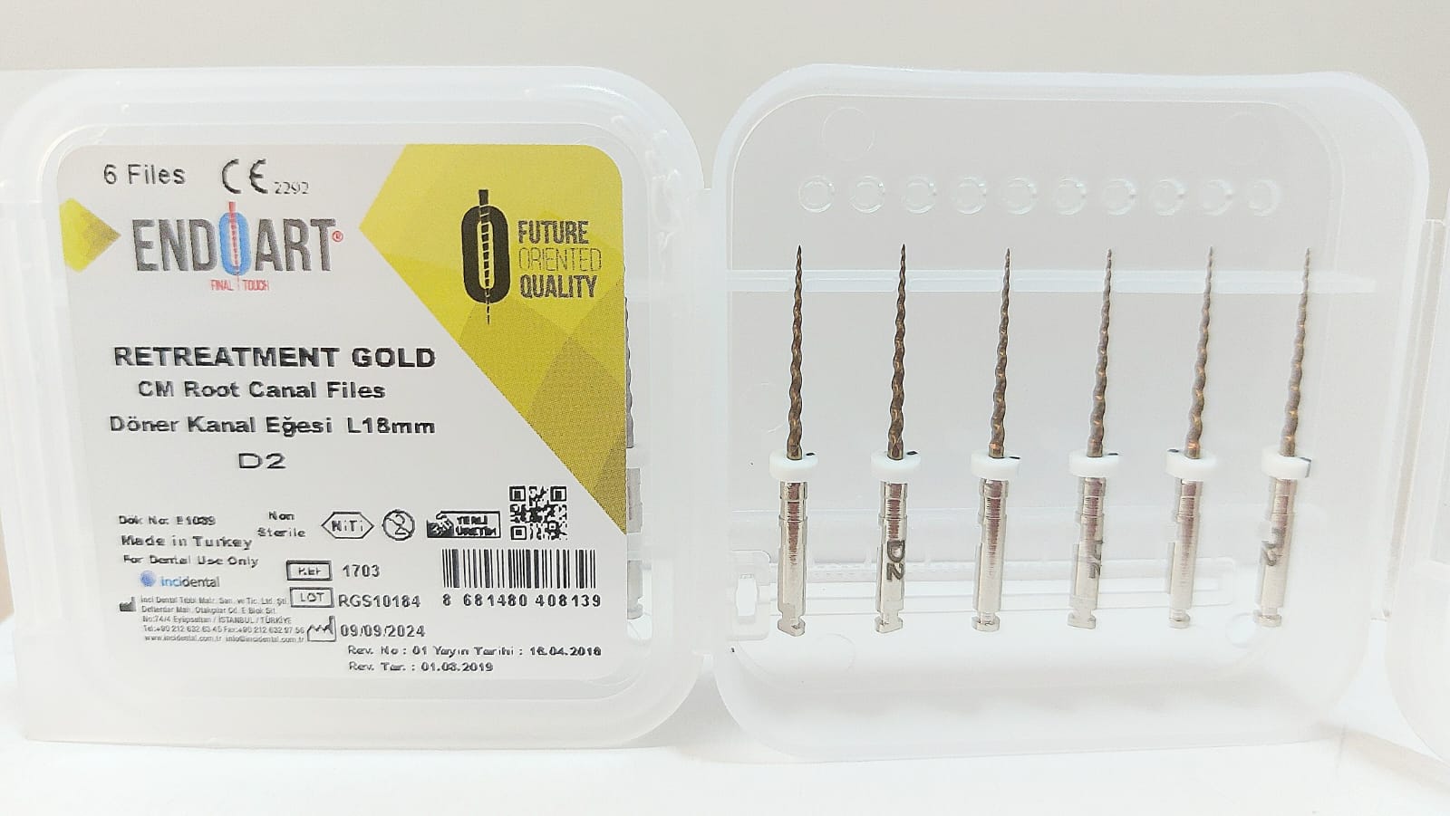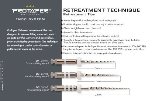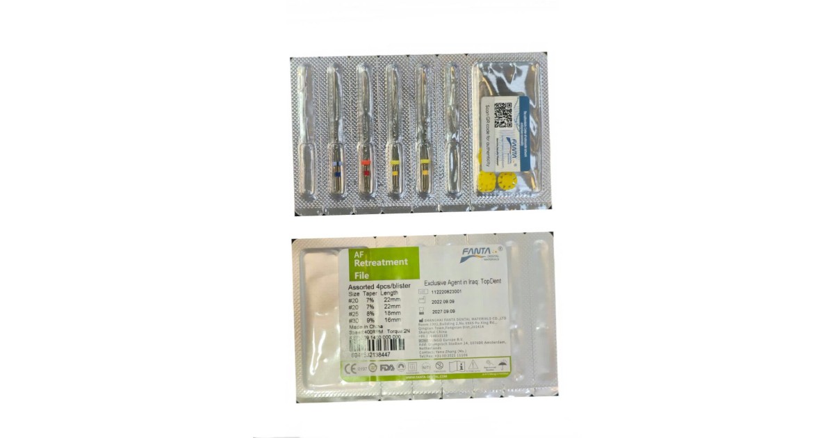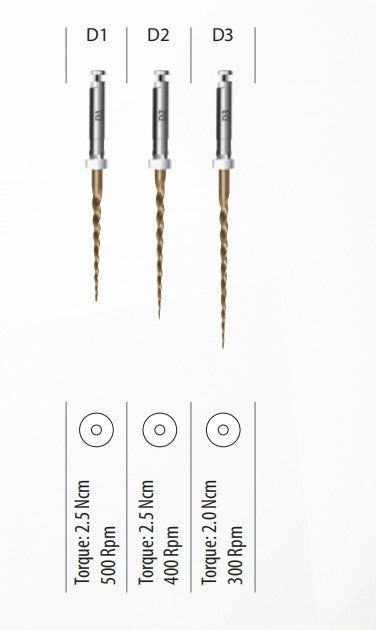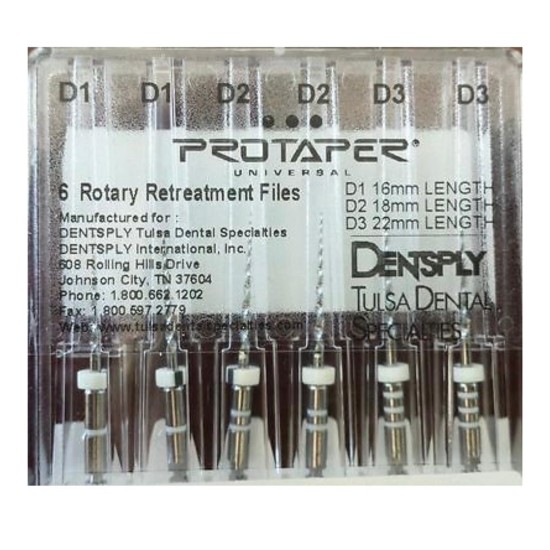 فایل روتاری – Retreament:برای درمان مجدد ریشه و خارج کردن مواد پر کردنی از جمله گوتا پرکا، سیلر ، مواد رزینی و فیلر قبل از شکلدهی کانال مورد استفاده قرار میگیرد.انعطافپذیری بسیار بالا، مقاومت بسیار بالا در برابر شکست و قابلیت برش بالا از ویژگیهای این محصول است.دارای 3 فایل میباشد:D1 با طول 16 میلیمتر و سایز 30 با تقارب 9٪ به رنگ آبی دارای سر برنده بوده و برای قسمت ابتدایی (1/3 کرونالی) و D2 باطول 18 میلیمتر و سایز 25 با تقارب 8٪ به رنگ قرمز برای قسمت میانی (1/3 مدیالی) و D3 با طول 22 میلیمتر و سایز 20 با تقارب 7٪ به رنگ زرد برای قسمت انتهایی کانال (1/3 اپیکالی) مورد استفاده قرار میگیرد.فایل روتاری برند M3در بستهبندی 6 عددی عرضه میگردد.****خرید تجهیزات دندانپزشکیبا کیفیت عالی و قیمت مناسب از سایت دندانت ******** برایخرید ابزار اندوبا کیفیت عالی کلیک کنید ******** خریدانواع فایل روتاریاز بهترین برندها کلیک کنید ****
