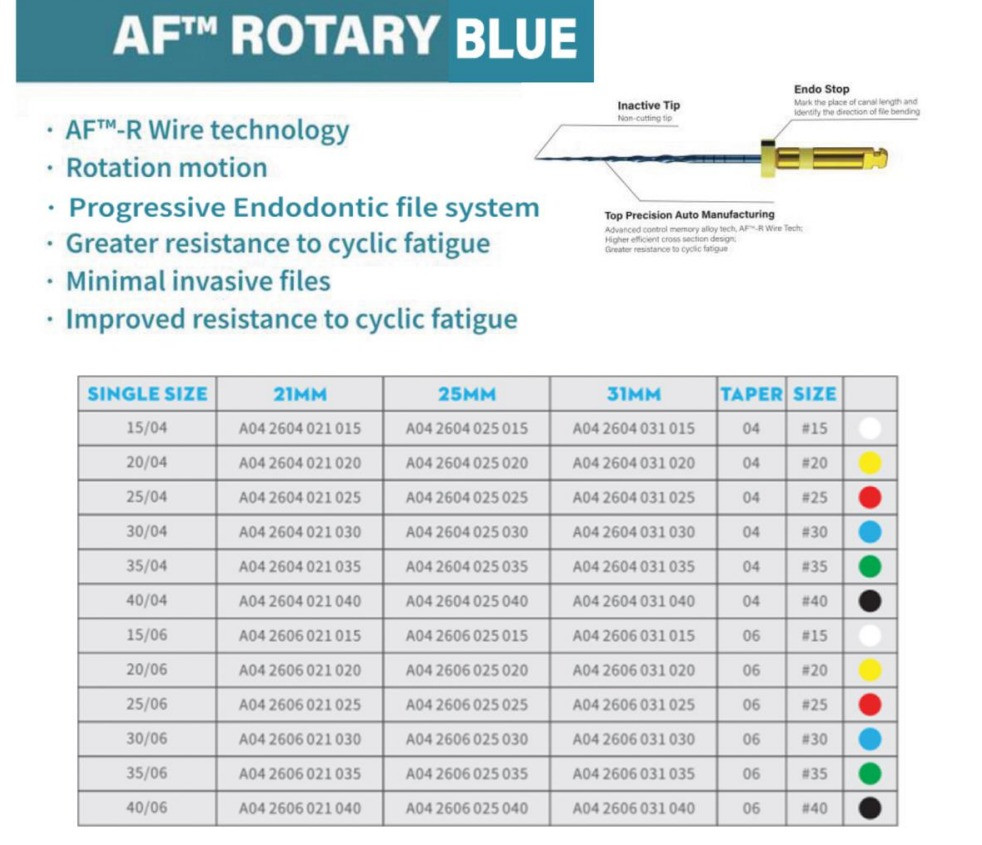 فایل روتاری آبی - Action Blue Rotary File:جهت شکل دهی سریع تر کانال ریشه مورد استفاده قرار می گیرد، انعطاف پذیری بالایی داشته و در برابر شکست مقاوم است.کانالهای با انحنای زیاد و باریک را به طور کامل شکل میدهد.حرکت منحصر به فرد جهت جلوگیری از گیر فایل به دیواره کانال و افزایش خروج دبری از دیگر ویژگیهای این محصول است.فایل روتاری آبی برند Incidental سری Action طول 25 میلی متر دربستههای تکسایز با سایز بندی S1 – S2 – F1 – F2 – F3 - F4 - F5 - SX و بسته آسورت حاوی سایزهای (SX-F3)در بستههای 6 عددی در فروشگاه اینترنتی دندانت عرضه میشود.****بهترین برندهایفایل روتاریرا از فروشگاه اینترنتی دندانت تهیه کنید******** بهترینابزار اندودر وبسایت دندانت****