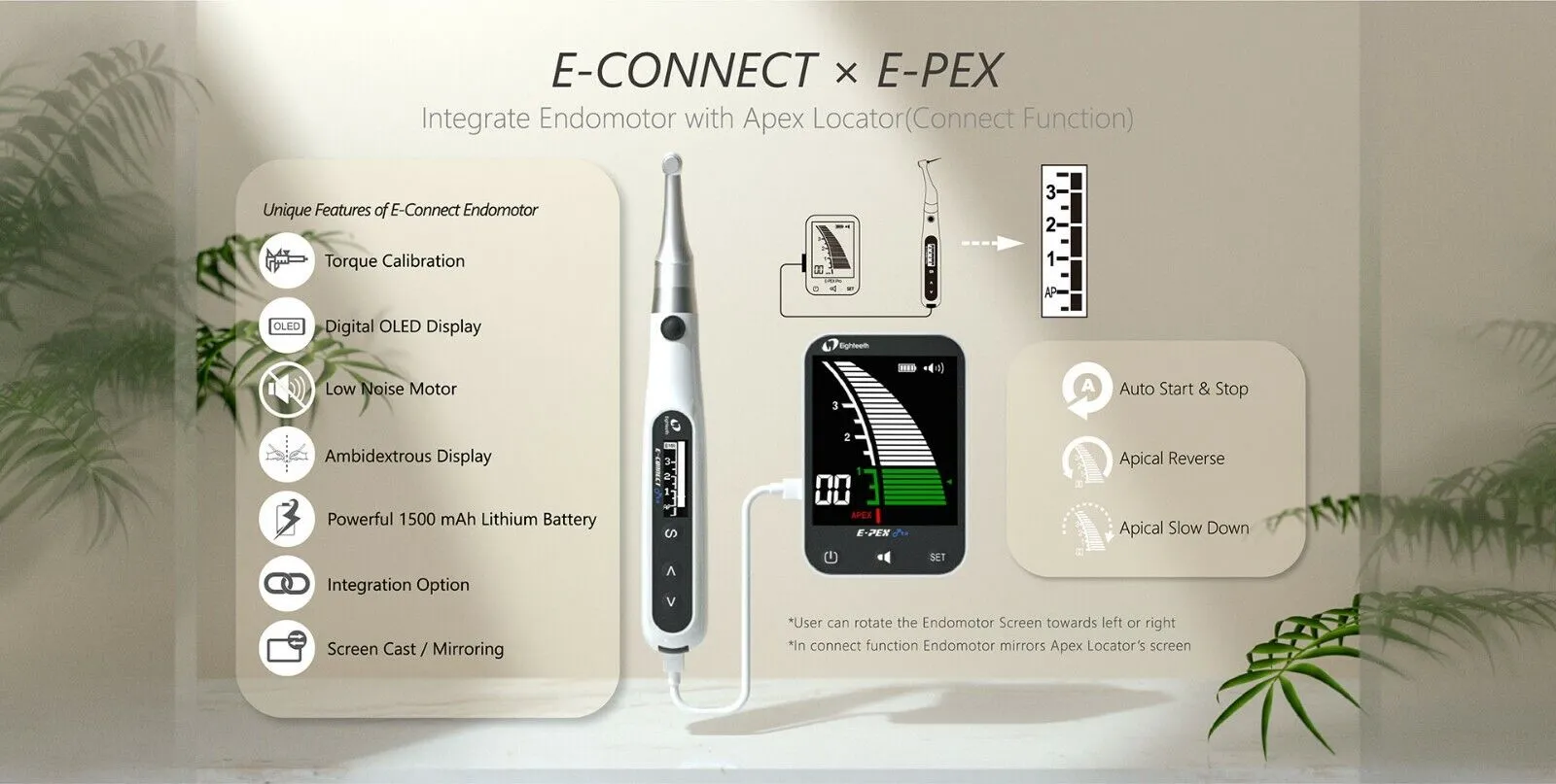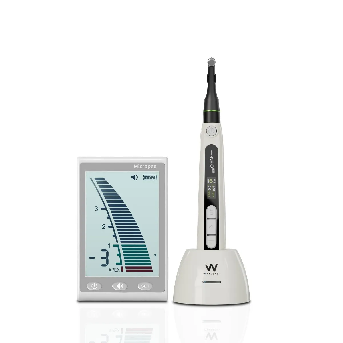 کاتالوگ محصولموتور اندو القايي (براش لس) با کمترین لرزش و صداداراي اپکس لوکيتور داخلي براي سهولت، دقت و ايمني بيشترقابليت کار با اپکس لوکيتور بطور جداگانهشارژ وايرلس، هندپيس سبک و بي سيم، طراحي ارگونوميکباتري پرتوان 2000 ميلي آمپرساعتسرعت قابل تنظيم بين 50 تا 1800 دور در دقيقهگشتاور قابل تنظيم بين 0.4 تا 5 نيوتون سانتي متررسيپروکال قابل تنظيم بين 20 تا 400 درجه با شمارش هاي 10 درجهدسترسي و ديد بسيار مناسب با کنترا آنگل سوپر ميني 1:6 (قطر 8 و ارتفاع 9.7 ميلي متر) با چرخش 360تنظيم و کاليبراسيون اتوماتيک گشتاورداراي 5 حالت کاري:Auto Apical Reverse / StopAuto StartAuto StopReciprocating (Fully adjustable angle)ATRاشتراک گذاری