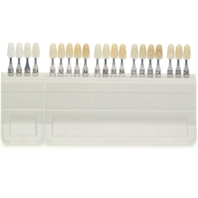 توضیحاتنمونه رنگ دندان ویتا Vita کلاسیکبرای تعیین رنگ لمینت، کامپوزیت و روکش دندان مناسب بیمار استفاده می گردد. این محصول اصلی بود و دارای شیدهای بلیچ نیز می باشد و کاربرد بسیاری داردزبانه های این کیت رنگ دندان قابل جدا شدن است. عوامل محیطی مانند نور طبیعی ، رنگ لباس و … در انتخاب رنگ تاثیر گذار خواهد بود پس باید به آن ها توجه نمود که اثر منفی روی انتخاب نگذارند.برای استفاده و تعیین رنگ متناسب با دندان بیمار، شیدهای مورد نظر را با 25 الی 30cm فاصله از دندان بگیرید و گزینه موردنظر را انتخاب نمایید.بعد از هر بار تست و استفاده شید باید ضدعفونی شود. برای این کار نمونه رنگ دندان ویتا را در دمای حداکثر 132 درجه سانتی گراد اتوکلاو کنید. همچنین میتوانید هر یک از رنگ های کالیته رنگ ویتا را با اسپری ملایم ضد عفونی کننده و یا پارچه آغشته به ضدعفونی کننده تمیز نمایید.