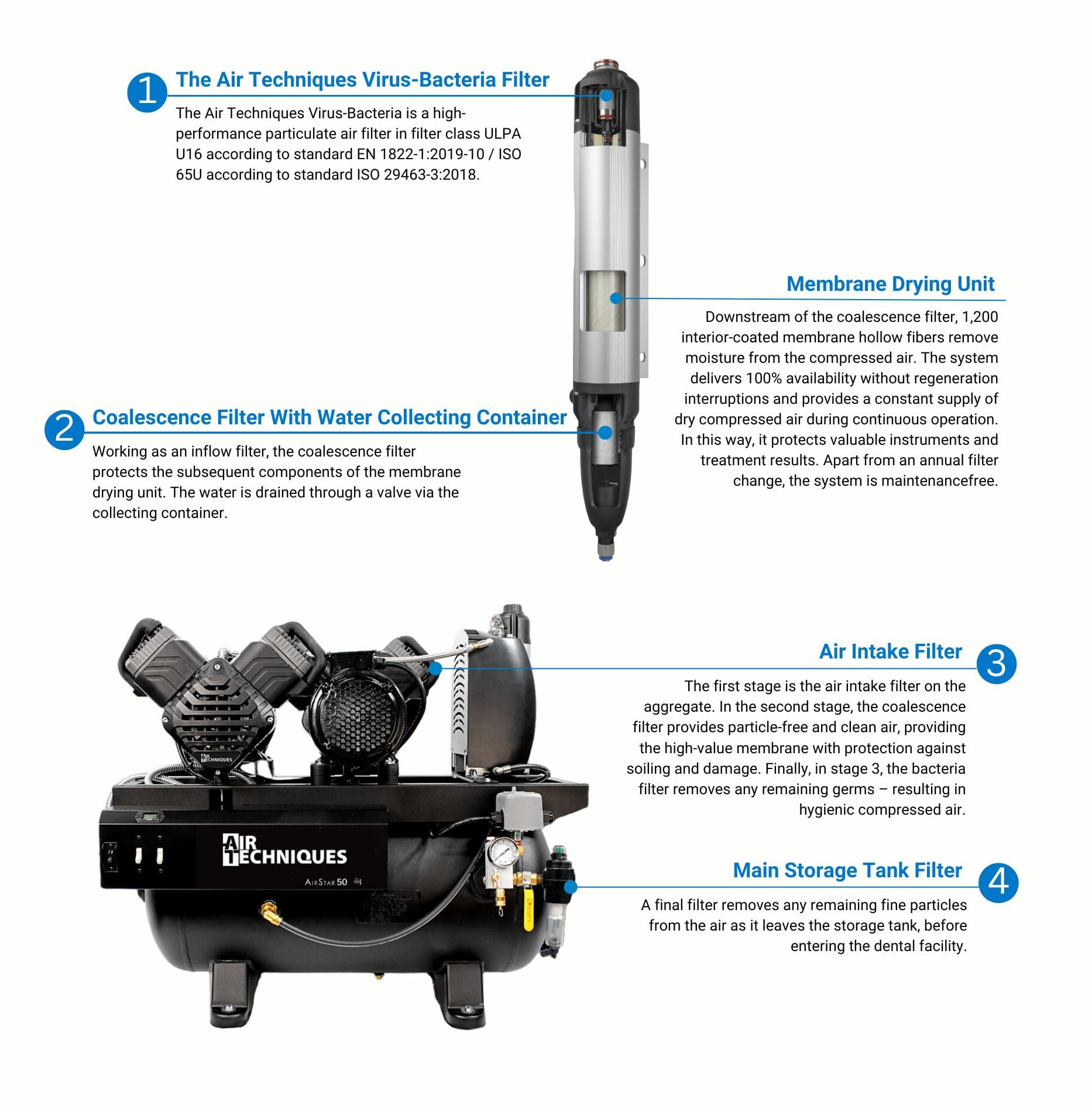 این کمپرسور Oill-Free در جدید ترین پیشرفت ها و تغییرات از طراحی wobble piston که قدرت و عملکرد بالایی دارد بهره می برد ، در مجموع این کمپرسور با یک سیستم خشک کن ( dryer) کاملا خودکار، هوایی خشک و تمیز به ما عرضه می کند.ویژگی هایAirStar Aero 100M :مخزنepoxyکارکرد پیوسته و مداومنگهداری آسان و بدون نیاز به تعمیر (maintenance free)طول عمر زیاد حتی در نوسانات فشارعرضه هوای فوق العاده تمیز و خشکبهره وری از انرژی در ازاء مصرف کم هوانقطه شبنم پایین (کمتر از 5 درجه سانتی گراد)