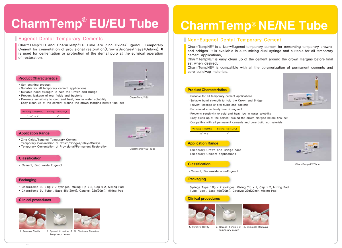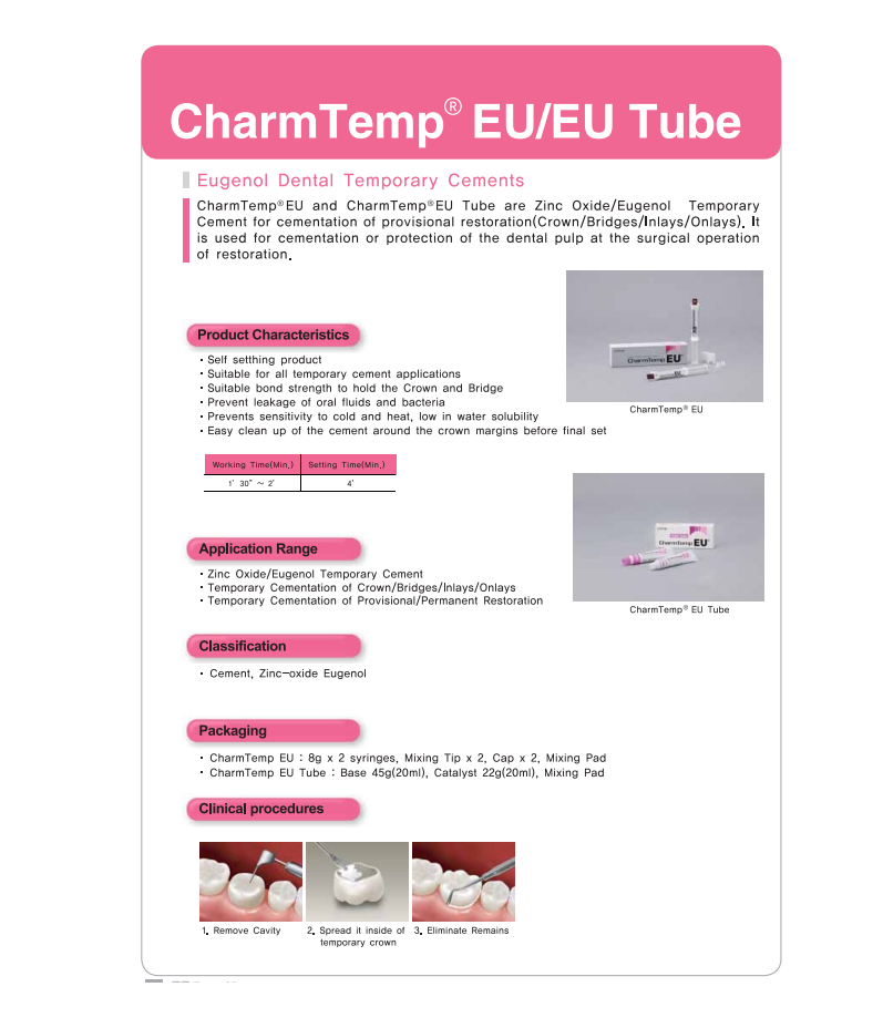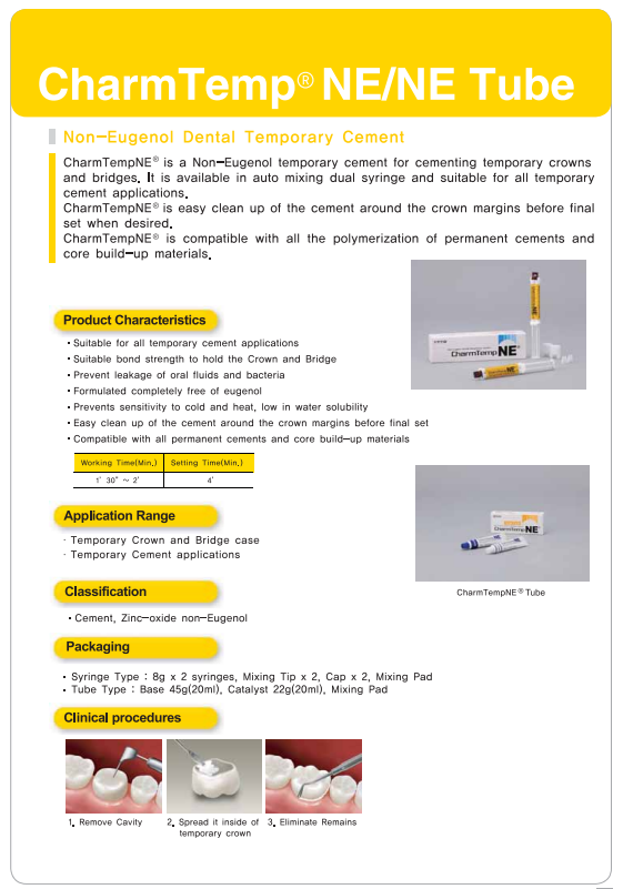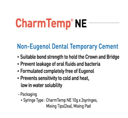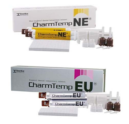توضیحاتسمان موقت فاقد اوژنول چارمفیل Charm Temp NEسمان موقت فاقد اوژنول برای سمنت کردن رستوریشن های موقتمناسب برای استفاده در کلیه کاربردهای سمان موقتاستحکام اتصالی کافی برای نگه داری روکش و بریجسهولت تمیز کردن سمان اضافی از لبه های رستوریشن از سفت شدن نهاییبسته بندیcharmTemp NE : دو سرنگ 10 گرمی + دو سری مخلوط کننده + دو کپسول + صفحه مخلوط کنcharmTemp NE Tube : بیس 52 گرم (20 سی سی ) + کاتالیست 20 گرم (20 سی سی ) + صفحه مخلوط کردن