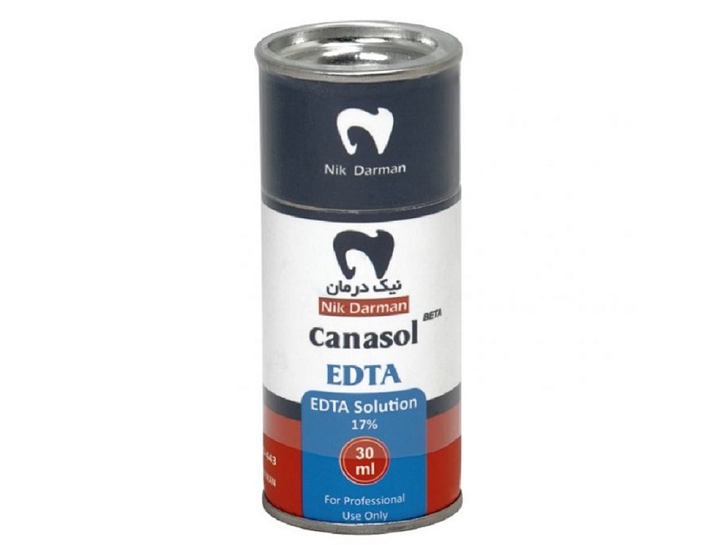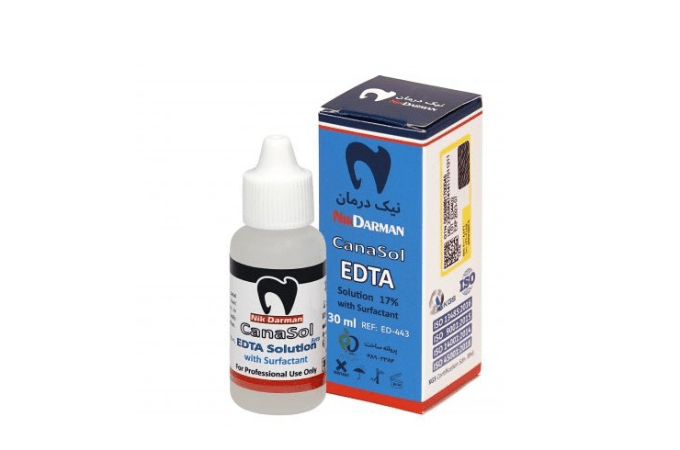 توضیحاتمحلول EDTA با pH خنثی جهت برداشتن لایه اسمیر دندان، لایه برداری کانال کلسیفه و تسهیل آماده سازی مکانیکی ریشه کانال بکار می رود.شلاته کردن یونهای کلسیم دیواره کانال باعث تعریض ریشه میشود.شستشوی نهایی کانال، باز کردن توبولهای عاجی، آماده سازی دیواره عاج جهت ارتقاء کیفیت باندینگ، و نرم کردن عاج با حذف لایه اسمیر ازموارد استفاده محصول است.ترکیبات:اتیلن آمین تترا استیک اسید (EDTA)، آب با خلوص دارویی، شوینده قلیایی.ویژگی های محصولمحلول EDTA هفده درصد با pH خنثیمایع شفاف، بی بو و بی رنگتمیز کننده دیواره عاجی پس از برداشت لایه اسمیرخارج کردن مواد غیرآلی و زوائد از کانالمناسب جهت کانال های باریک،کلسیفه شده و دندان های خلفیحاوی سورفکتانت به منظور مرطوب سازی بهترحجم: 30 میلی لیتر