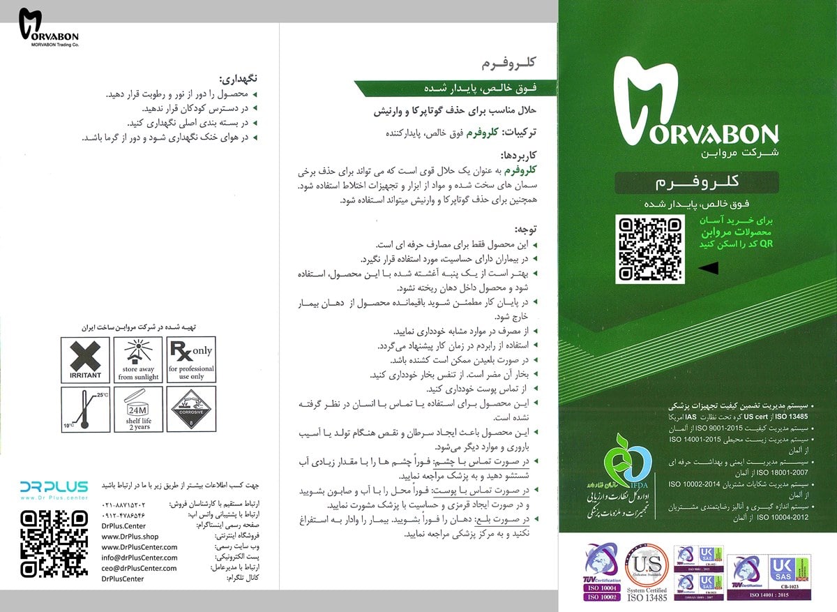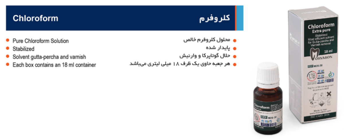 توضیحاتمعرفی و خرید کلروفرم Canasol Chloroform –:به عنوان یک ماده حلال در دندانپزشکی به ویژه در درمان مجدد ریشه استفاده میشود.حلال گوتا پرکا و وارنیش است.محلول کلروفرم خالص میباشد.کلروفرم مروابن در حجم 18 میلیلیتر عرضه میگردد.**می توانید از کد تخفیف برای خرید این محصول استفاده کنید.