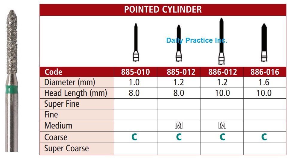 فرز الماسی مخصوص توربین - Pointed cylinder:در آماده سازی حفره، آماده سازی کراون و تخلیه آمالگامهای قدیمی کاربرد دارد.فرز الماسی مخصوص توربین برند دندیادر بسته های 5 عددی عرضه می گردد.