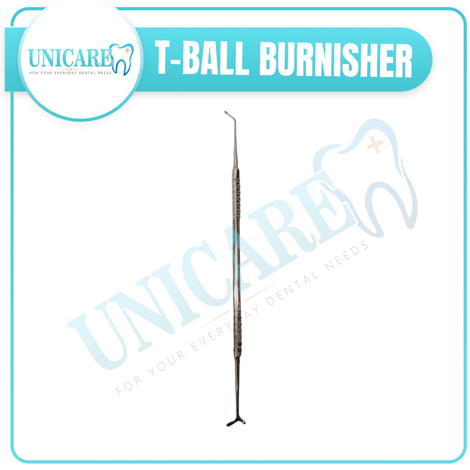 تی برنیشر - T Burnisher:برای صاف کردن آمالگام بعد از فشرده کردن آن و برای تراز کردن سطح آمالگام روی دندان ترمیم شده مورد استفاده قرار می گیرد.برای صیقلی کردن و جلا دادن آلیاژهای ترمیمی به صورت یک طرفه یا دو طرفه مورد استفاده قرار می گیرد.تی برنیشر برند دنتال دیوایسدر سایز متوسط و جنس استیل عرضه می گردد.