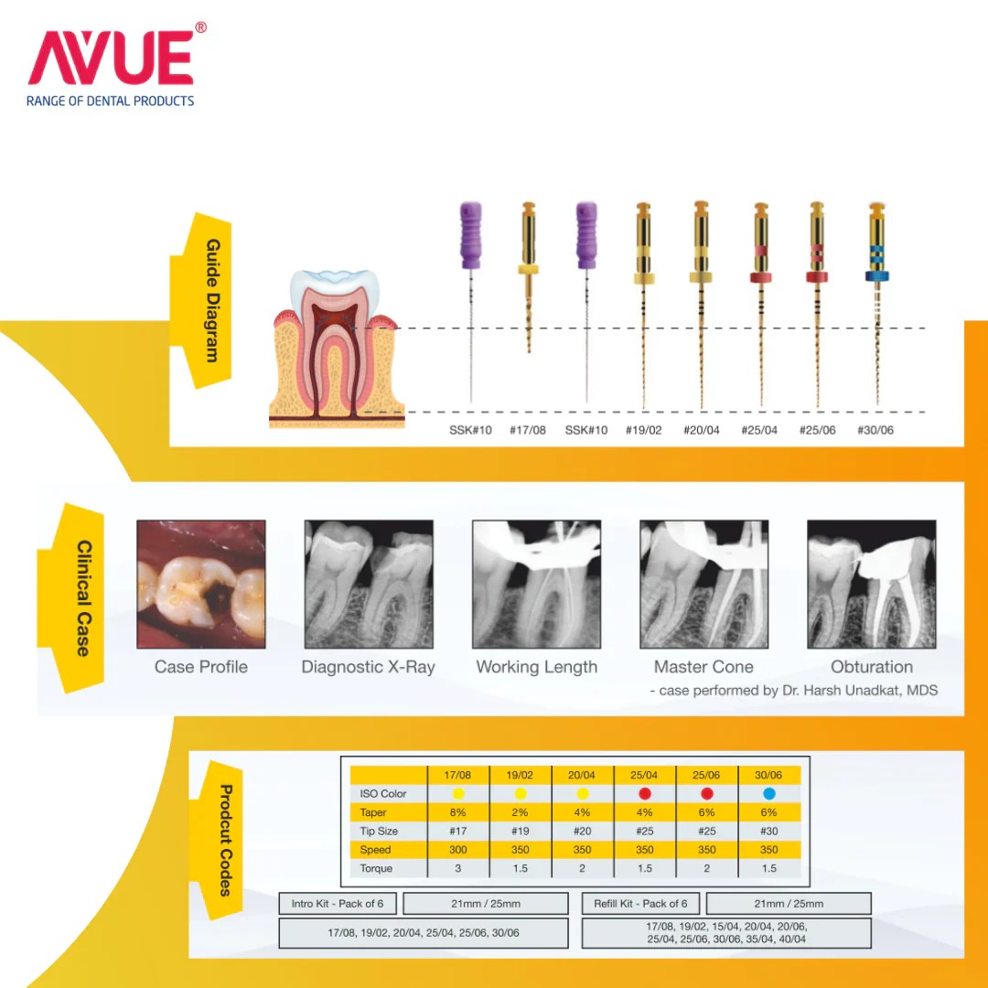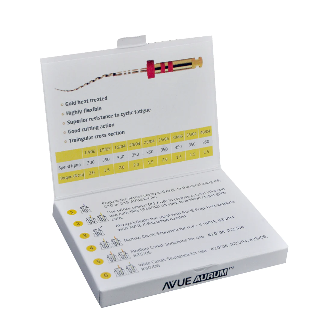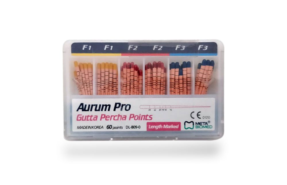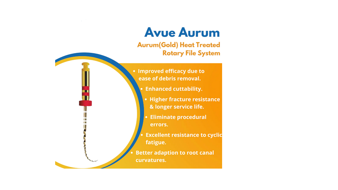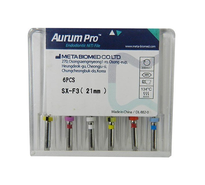 فایل روتاری - Aurum Pro 31:فایل اندو روتاریAurum Proآسورت بر اساس سیستم اندو پرو طراحی و تولید شده است. پک آسورت دارای 6 فایل است که عبارتند ازOrifice Opener -دو عدد فایلShaperکه مخصوصShapingدیواره کانال است و سه عدد فایل.Finisherکه برای شکل دهی و اندو ناحیه اپکس استفاده میشود. استحکام و مقاومت این فایل دوبرابر فایل های یونیورسال است.فایل روتاریAurum Proنسبت به فایل های یونیورسال دارای دو برابر مقاومت بیشتر است و در سیکل های چرخشی با نرخ کمتری فرسوده میشود و یا می شکند. بیشینه سرعت و گشتاور این فایل ها به ترتیب 250 دور در دقیقه و 2.5 نیوتن بر سانتی متر است.یکی از ویژگیهای مهم یک فایل مقاومت آن در برابر شکستن است. هرچه فایل مقاومتر و از استحکام بیشتری برخوردار باشد، احتمال شکستن فایل در پروسه اندو کاهش مییابد. علاوه بر استحکام، انعطاف پذیری یک فایل نیز فاکتور مهم است. عملیات حرارتی انجام شده بر روی آلیاژ Niti بهبود یافته، فایلهای Aurum Blue و Aurum Pro را به یکی از مقاومترین و در عین حال منعطفترین فایل های روتاری تبدیل کرده است.در پروسه اندو، زمانی که از دهانه کانال به سمت ناحیه اپیکالی میرویم نیاز به فایل سختتر کاهش و در عین حال نیاز به یک فایل منعطفتر افزایش مییابد. علاوه بر این نباید از تراش نرم و صاف دیواره کانال نیز غافل شد. سطوح الکتروپولیش شده فایلها با کاهش زدودگی بقایای فلز از سطح فایل، با حفظ برندگی فایل، سطحی صیقلی به آن داده است که باعث تراش نرم دیواره کانال شده و از ایجاد میکروگپ جلوگیری میکند. توان عملکردی فایلها در سرعت های 300 و 500 دور در دقیقه و گشتاورهای 1.5 و 2 نیوتن بر سانتیمتر به ترتیب در فایلهای Aurum Pro و Aurum Blue از دیگر ویژگیهای این فایلها است.فایل های Aurum pro از جدیدترین فایل های روتاری تولید شده کمپانی متا بایومد با سیستم protaper shapingاست. از ویژگی های این فایل ها می توان به موارد زیر اشاره کرد:ساخته شده از آلیاژ NITIمقاومت بالا در برابر دفرمه شدن فایل ناشی از گرمااستحکام عالی ناشی از عملیات حرارتی انجام شده بر روی فایل در حین فرایند ساختالکتروپولیش شده (افزایش انعطاف پذیری فایل و کاهش ریسک آسیب رساندن به کانال در حین عملیات اندو)ماکزیمم سرعت قابل تحمل: 300 دور در دقیقهماکزیمم گشتاور قابل تحمل: 1.5 نیوتن بر سانتی م
