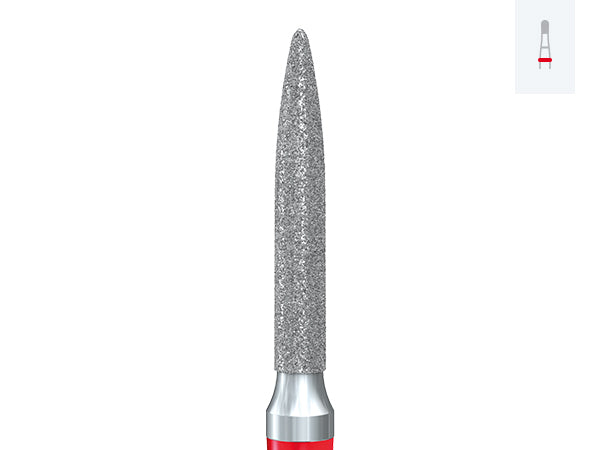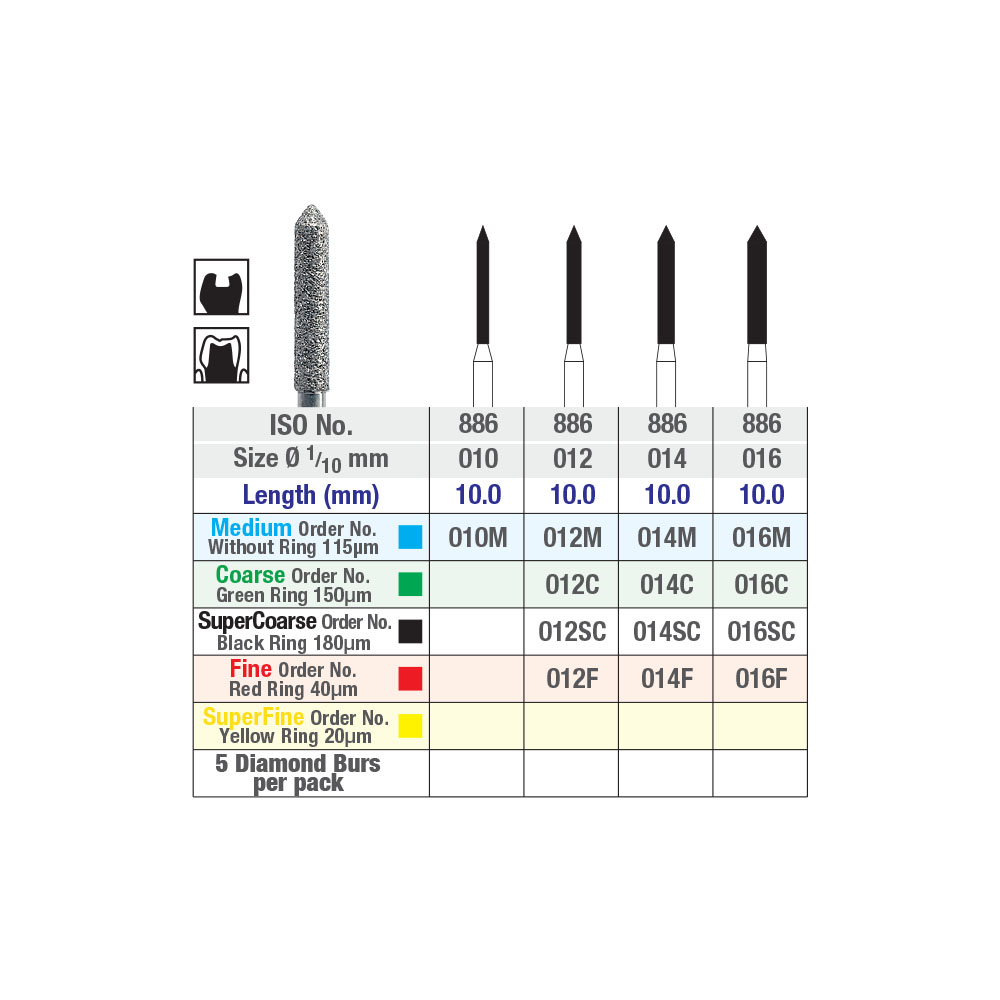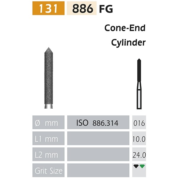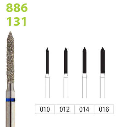 فرز الماسی مدل استوانه ای سوزنی توربین فرم 131 - Dental Diamond Burs 886:این فرز در خالی کردن پرکردگیهای قدیمی مورد استفاده قرار میگیرد.در آماده سازی کانال کاربرد دارد.فرز الماسی شماره 886 با فرم 131از برند DFS ساخت آلماندر رنگ سبز و سایزهای012، 014، 016 در بسته بندی 5 عددی عرضه می گردد.