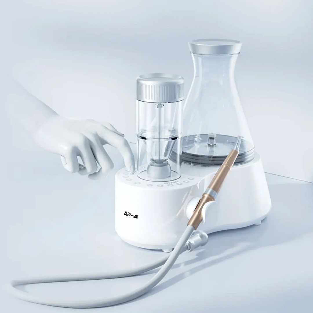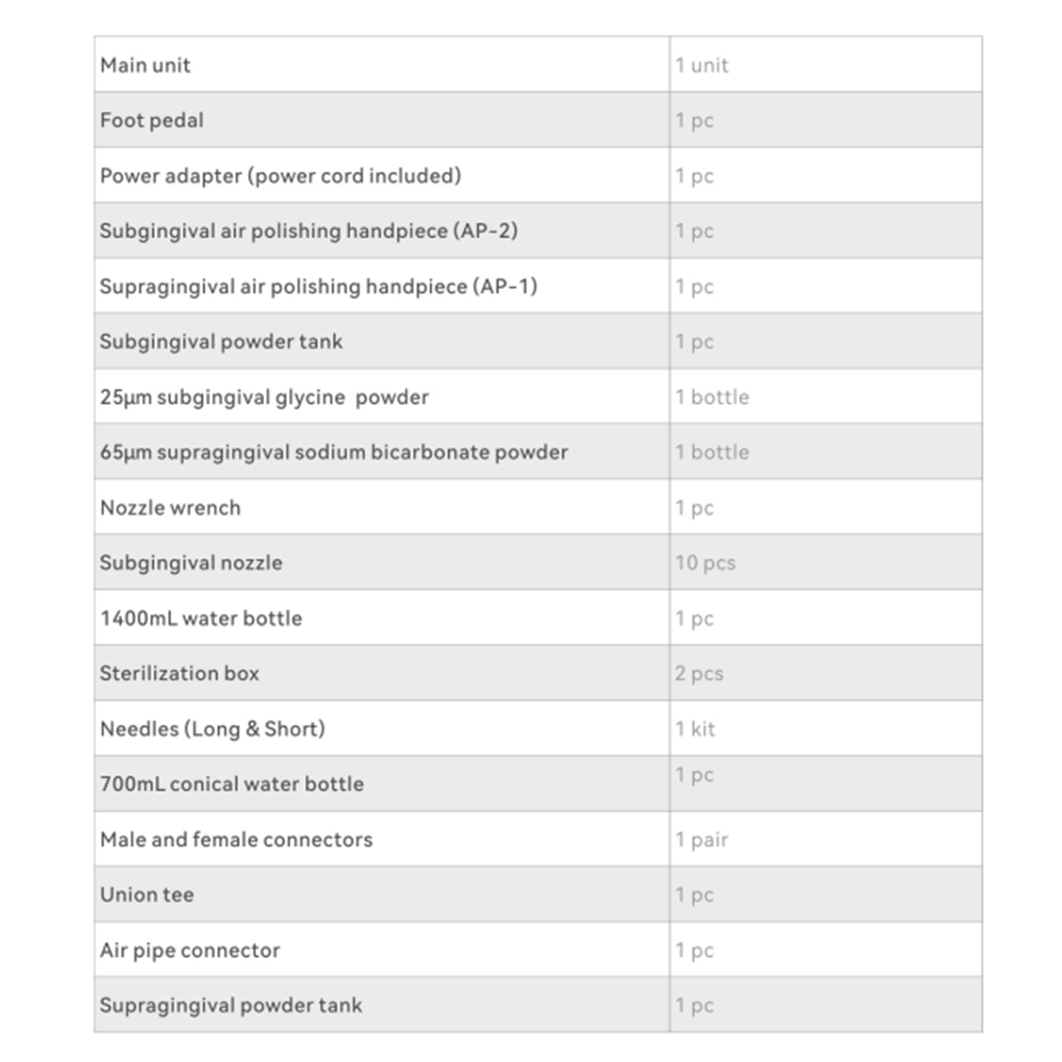 توضیحاتکاربرد:– برداشت کامل لک و رنگ ناشی از مصرف سیگار، چای، قهوه و دیگر نوشیدنی های رنگی– پاکسازی اطراف براکت و وایرهای ارتودنسی– تمیز نمودن سطح اکلوزال قبل از استفاده از سیلانت– تمیز نمودن دنتین حساس و پاکت های پریودنتال– اچینگ انامل، دنتین و پرسلن قبل از استفاده از باندینگپودر بی کربنات سدیم پودری است که بطور معمول به همراه این دستگاه استفاده می گردد اما اخیراً از پودرهای دیگری از جمله گلایسین، کلسیم کربنات، کلسیم سدیم فسفوسیلیکات، آلومینیوم تری هیدروکساید و اریتریتول نیز استفاده می گردد که هر یک ویژگی خاصی دارند و باتوجه به شرایط بالینی بیمار، حق انتخاب بیشتری را به دندانپزشک ارائه داده اند– گلایسین (Glycine): ماهیت آمینو اسیدی و نرمی دارد و قدرت سایندگی آن نسبت به دیگر پودرها کمتر می باشد و طعمی نمکی ندارد، به راحتی در آب حل می گردد و گزینه ای مناسب برای استفاده در ساب جینجیوال می باشد.– کلسیم کربنات (Calcium carbonate): متشکل از کریستال های کروی شکلی می باشد و به صورت موثر لک و پلاک های سطح دندان را برمی دارد، اما به دلیل احتمال آسیب زدن به دنتین برای تمیز کردن نواحی ساب جینجیوال توصیه نمی گردد.– کلسیم سدیم فسفوسیلیکات (Calcium sodium phosphosilicate): یک ماده بیواکتیو که باعث بسته شدن توبول های دنتین و کاهش میزان حساسیت می شود.– آلومینیوم تری هیدروکساید (Aluminum trihydroxide):با شباهت نسبی به سدیم بی کربنات، برای افرادی که برای استفاده از سدیم محدودیت دارند، ایده آل است اما به عنوان یکی از معایب آن، می توان به ایجاد اختلال و مشکل در عملکرد برخی از مواد ترمیمی اشاره نمود.– اریتریتول (Erythritol): یک قند الکلی می باشد که بطور مطلوبی باعث کاهش پاکت های پریودنتال بزرگتر از چهار میل می گردد.دستگاه ایر پالیش AP-A– یکی از دقیق ترین و برترین سیستم ایرپالیش– مجهز به دو هندپیس برای تمیز کردن Supragingival و Subgingival– سهولت استفاده بواسطه شلنگ و هندپیس جداشونده و داشتن مخزن شفاف و مجزا برای آب و پودر– مخزن پودر کاملاً شفاف و قیفی شکل برای خروج پایدار پودر پایدار– هندپیس جدا شونده و قابل اتوکلاو (134 درجه سانتی گراد) برای تمیز کردن و استریل کردن آسان آن– هندپیس سبک و در نتیجه کاهش خستگی دست– قابلیت چرخش 360 درجه نازل به منظور دسترسی کامل آن به تمامی نواحی– خروجی پود