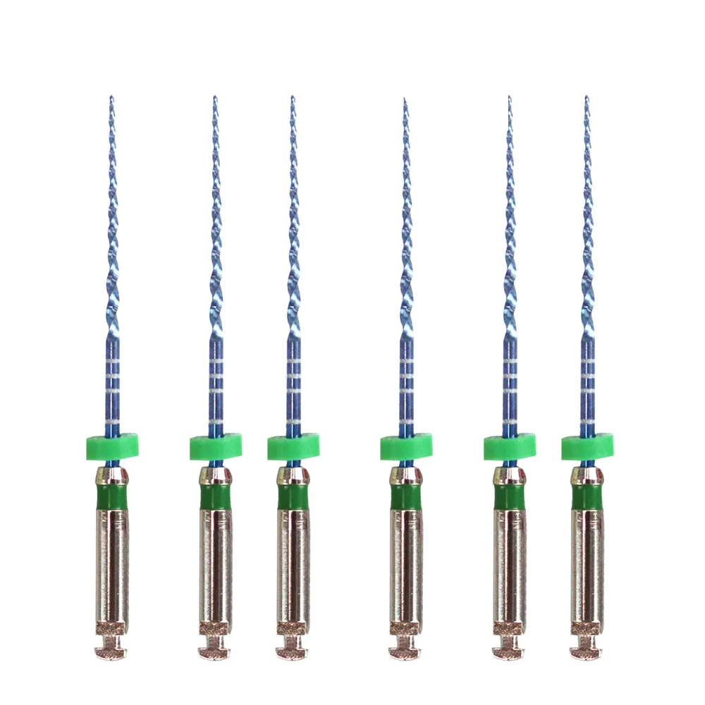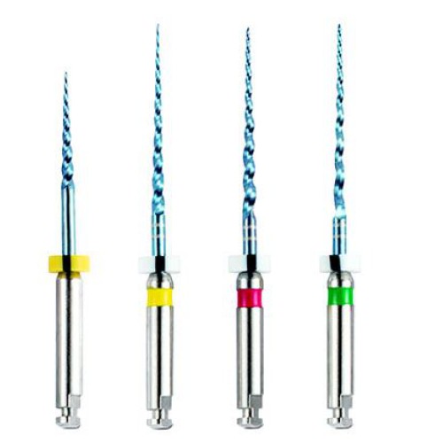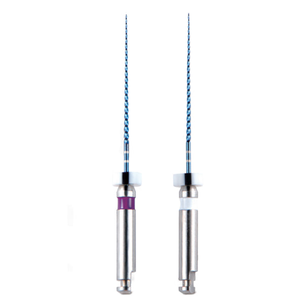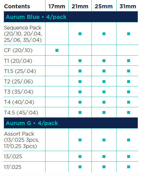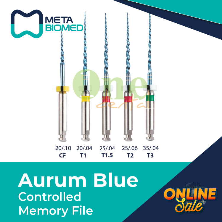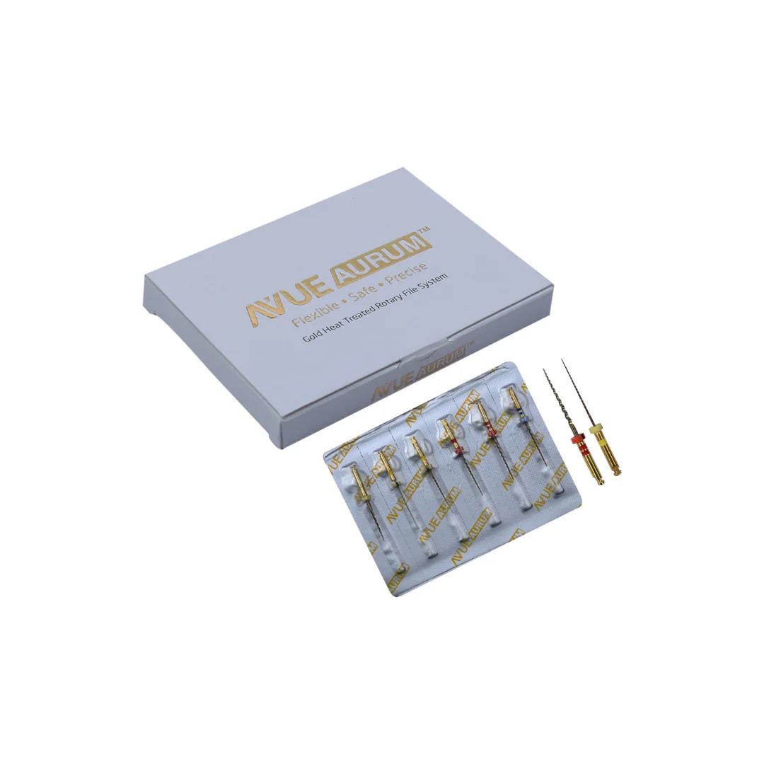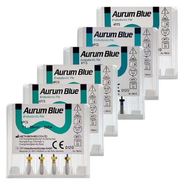 فایل روتاری 4 عددی - Aurum Blue Triangle 25%:یکی از ویژگی‌های مهم یک فایل مقاومت آن در برابر شکستن است. هرچه فایل مقاوم‌تر و از استحکام بیشتری برخوردار باشد، احتمال شکستن فایل در پروسه اندو کاهش می‌یابد. علاوه بر استحکام، انعطاف پذیری یک فایل نیز فاکتور مهم است. عملیات حرارتی انجام شده بر روی آلیاژ Niti (جهت آشنایی با این آلیاژ کلیک کنید) بهبود یافته، فایل‌های Aurum Blue و Aurum Pro را به یکی از مقاوم‌ترین و در عین حال منعطف‌ترین فایل های روتاری تبدیل کرده است.در پروسه اندو، زمانی که از دهانه کانال به سمت ناحیه اپیکالی می‌رویم نیاز به فایل سخت‌تر کاهش و در عین حال نیاز به یک فایل منعطف‌تر افزایش می‌یابد. علاوه بر این نباید از تراش نرم و صاف دیواره کانال نیز غافل شد. فایل‌های Aurum Blue با دو سطح مقطع مربعی (دو فایل اول) و مثلثی (دو فایل آخر) باعث ایجاد استحکام و سختی بیشتر در فایل های ابتدایی و ایجاد انعطاف بیشتر در دو فایل آخر شده است. سطوح الکتروپولیش شده فایل‌ها با کاهش زدودگی بقایای فلز از سطح فایل، با حفظ برندگی فایل، سطحی صیقلی به آن داده است که باعث تراش نرم دیواره کانال شده و از ایجاد میکروگپ جلوگیری می‌کند. توان عملکردی فایل‌ها در سرعت های 300 و 500 دور در دقیقه و گشتاورهای 1.5 و 2 نیوتن بر سانتی‌متر به ترتیب در فایل‌های Aurum Pro و Aurum Blue از دیگر ویژگی‌های این فایل‌ها است. طراحی Memory Shape فایل های Aurum Blue قابلیت ورود و شکل دهی به کانالهای Dilaceration را افزایش داده و فشار جانبی به دیواره کانال در حین اندو را کاهش می‌دهد که باعث حفظ شکل اصلی کانال در ناحیه اپیکالی می‌شود.