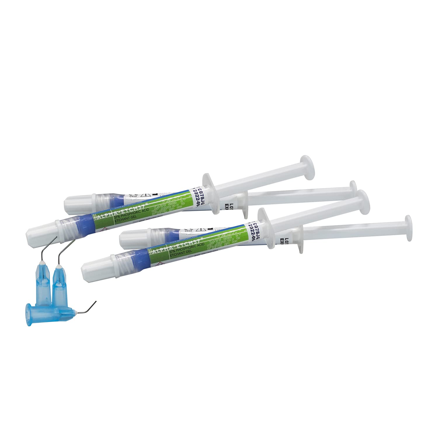 توضیحاتژل اسید فسفریک 37 درصد P-Etchبا ویسکوزیته غیر نیوتنی جهت اچینگ عاج و مینای دندان برای ایجاد سطوح باندینگ ایده آل به ساختار دندان است. P-Etch در عمق اچینگ، خود محدودشونده است و یک الگوی اچ ایجاد می کند که باندینگ ها می توانند برای افزایش استحکام باند و کاهش حساسیت به آن نفوذ کنند. ویسکوزیته منحصر به فرد این محصول با توجه به غلظت دهنده پلیمری، قرارگیری دقیق را تسهیل میکند و همچنین با شستشوی راحت این محصول، از تداخل با مواد رزینی جلوگیری میکند.ویژگی ها:• خاصیت اچینگ با عمق نفوذ 1/9 میکرومتر در ۱۵ ثانیه به منظور عدم ایجاد حساسیت دندانی( خاصیت Self limiting در میزان عمق اچ در عاج)• حذف کامل Smear Layer و افزایش استحکام برشی در باندینگ با کامپوزیت• دارای خاصیت Thixotropic ( افزایش تنش برشی جهت کاهش اتصال مینا و عاج ) به منظور قرارگیری دقیق در محل• پیشگیری از پوسیدگی مجدد دندان به دلیل دارا بودن ماده آنتی باکتریال بنزالکونیوم کلراید• دارای ویسکوزیته ایده آل جهت Blue Microtip و Inspiral Brush tip• امکان نفوذ به Pit & Fissure های ریز• کاربرد سریع و موثر در محل مورد نظر• شستشوی کامل و آسان از سطح دندان بدون پخش شدگی در دهان• زیست سازگاری مناسب مطابق با ISO 10993• غیر سمی و غیر حساسیت زا مطابق با ISO 10993-5-10این محصول در دو نوع ویسکوزیته High و Low در بسته بندی زیر عرضه می گردد:سه سرنگ 2/5 میلی لیتر به همراه درپوش