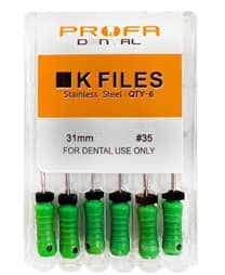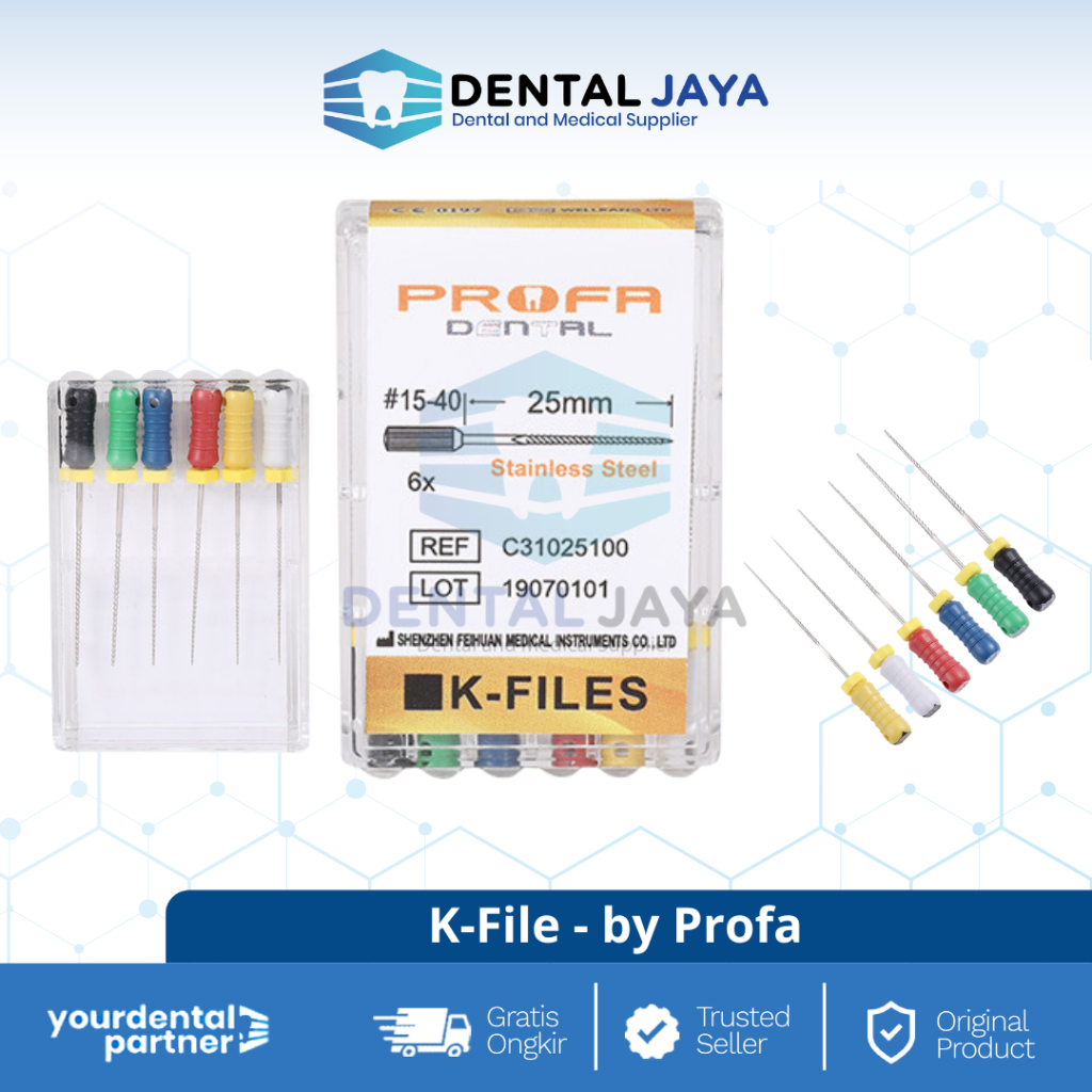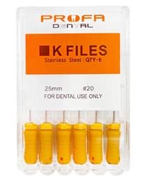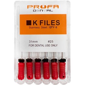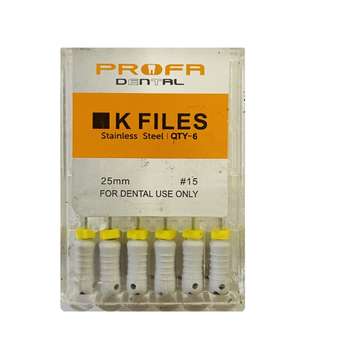 توضیحاتکا فایل پروفا k file PROFA ابزاری برای تمیز کردن و شکلدهی سیستمهای کانال ریشه است که از جنس استیل ضدزنگ یا نیکل و کروم ساخته می شود. این ابزار به عنوان پرکاربردترین فایل دستی برای عصب کشی دندان به شمار می رود. سطح مقطع کافایل ها به صورت متقارن مربعی و مثلثی شکل بوده و بیشترین استفاده آن، در بررسی و رد کردن قسمتهای سخت در کانال ریشه است.دندانپزشک در ابتدا سوراخ کوچکی در دندان ایجاد میکند تا از این راه بتواند به کانال ریشه دسترسی پیدا کند؛ سپس k فایل را وارد میکند و به آرامی میچرخاند تا دندانها تمیز و عاری از هرگونه آلودگی شود. در مرحله بعد، با همین ابزار به دیوارهها شکل میدهد تا آنها را برای پر کردن آماده کند.کا فایل پروفا دارای مقاومت بالا هستند و با دارا بودن دسته ارگونومی، کار را برای پزشک راحتتر می کنند. این محصول معمولا در سایزهای متنوع و رنگبندیهای مختلف عرضه میشود.
