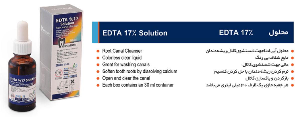 توضیحاتویژگی هایمحلول EDTA 17% – مروابن:این محلول مایعی بی بو و بی رنگ می باشد.به عنوان پاک کننده دیواره عاجی بعد از حذف لایه اسمیرمناسب جهت شستشوی پایانیدارای کاربرد در کانالهای باریک و دندانهای خلفیسهولت کاربرد در پاکسازی و باز کردن کانالروش مصرف محلول 17% EDTA مروابن – MORVABON EDTA 17% SOLUTION:مقداری از محلول را با سرنگ برداشته، کانال را به وسیله آب شستشو داده و برای حذف کامل مواد آلی و معدنی و یون های کلسیم، چند بار شستشو را تکرار کنید بعد از پایان شستشو کانال را به وسیله سرم فیزیولوژی بشوئید.نگهداری:دور از نور باشد.در دسترس کودکان نباشد.در صورت انقضای تاریخ مصرف استفاده نگردد.در دمای محیط و در بسته بندی اصلی نگهداری شود.پس از استفاده حتماً درب محلول بسته شود تا آلوده نشود.قبل از مصرف محلول را تکان دهید.توجه:در موارد مشابه استفاده نگردد.در زمانی که با پوست تماس داشته باشد با آب و صابون فراوان شسته شود.در زمانی که کار تمام شد مابقی مواد از دهان بیمار خارج شود.اگر بلعیده شود آب فراوان بنوشید و به پزشک مراجعه نمایید.در زمان کار با این محلول حتماً از رابردم استفاده گردد.