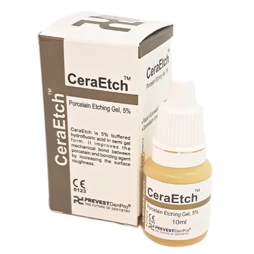 کاتالوگ محصولمعرفی:ژل اسید اچ پرسلن CERANIC ETCH هیدروفلوئوریک 9% برای اچ کردن سطح روکش های شکسته پرسلن در داخل دهان می باشد و همچنین محصول برای اچینگ پرسلن ونیر، اینله، آنله، کراون و براکت های ارتودونسی قبل از باندینگ کاربرد دارد.تركيبات:اسید هیدروفلوئوریک، تغلیظ کننده، رنگروش استفاده:لثه و بافت نرم مجاور ناحیه ترمیم را کاملا ایزوله کنید و مطمئن شوید با محصول در تماس نباشد.سطح پرسلن را با فرز مناسب بخوبی تراش دهید.یک لایه سرانیک ® اچ را روی سطح تراش خورده پرسلن قرارداده و شصت ثانیه صبر کنید.ژل را با ساکشن برداشته و سطح را کاملا با پوار آب بشویید.سطح پرسلن باید سفید و زبر شده باشد، درغیر اینصورت مراحل 3 و 4 را تا رسیدن به نتیجه مطلوب تکرار نمایید.توجه:رطوبت و بزاق حین انجام مراحل، کیفیت ترمیم را کاهش می دهد.|با استفاده از ساکشن در مجاورت ترمیم، مانع از انتشار گاز سمی در حفره دهان شوید.هشدار:ژل اسید اچ پرسلن CERANIC ETCH فقط جهت مصرف توسط دندانپزشک استفاده از رابردم و تجهیزات ایمنی هنگام استفاده از این محصول ضروری است|از تماس محصول با بافت های نرم، چشم و پوست جدا جلوگیری شود، در صورت تماس بلافاصله با پنبه و الکل کاملا پاک کنید و سپس با آب و صابون بشوییددر صورت بلعیدن، مقدار فراوانی آب بنوشید. استفراغ نکنید و به پزشک مراجعه کنیداز خروج کامل محصول از دهان پس از اتمام کار مطمئن شوید.شرایط نگهداری:در دمای محیط (بین 10 تا 25 درجه سانتیگراد) دور از تابش نور مستقیم نگهداری شود.|دور از دسترس کودکان نگهدارید.پس از استفاده درب را به دقت ببندید.اشتراک گذاری