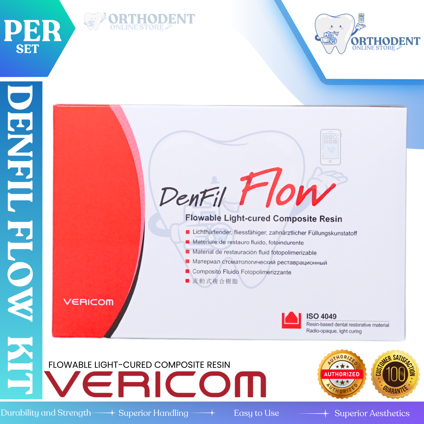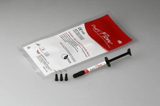 توضیحاتکامپوزیت دنفیل Denfil مدل FLOWنوعی کامپوزیت میکروهیبرید می باشد که در کشور کره جنوبی تولید و عرضه می شود.یک عدد سرنگ 2g بعلاوه چندعدد سری سرنگ در جعبه محصول موجود می باشد.کاربردهای کامپوزیت دنفیل Denfil مدل FLOWاستفاده به منظور ترمیم پوسیدگی های مستقیم کلاس 3 و 4 و 5قابلیت استفاده به عنوان لاینر در پوسیدگی های کلاس 1 و 2کامپوزیت دنفیل Denfil مدل FLOW به عنوان ماده ترمیمی در قسمت های آسیب دیده و پرکردگی های غیر مستقیم مورد استفاده قرار می گیرد.این محصول به جای فیشورسیلانت نیز قابل استفاده می باشد.برای پرکردگی های موقت کاربردی می باشد.مزایای کامپوزیت دنفیلفلوکامپوزیت دنفیل Denfil مدل FLOW از انقباض کم و خواص مکانیکی عالی برخوردار است و در دسته کامپوزیت های سیال قرار دارد.خاصیت سیال موجب می شود که قابلیت پرکردن حفره های باریک و عمیق به خوبی انجام شود که کامپوزیت دنفیل فلو نیز از این خاصیت بهره مند است.تنها به 20 ثانیه زمان برای کیور شدن توسط لایت کیور نیاز دارد.