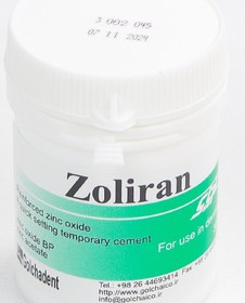 توضیحاتزولیران یک سیمان با پایه اوژنول و زینک اکساید بوده وبه عنوان یک ماده پرکننده موقت بعد از آماده سازی دندان و تراشیدن قسمت های پوسیده دندان ایده آل می باشد.همچنین به عنوان عایق شیمیایی حرارتی وLinerدر زیر مواد ترمیمی می تواند مصرف شود.این ماده به عنوان سیمان موقت درCrownوInlayها مصرف می شود.
