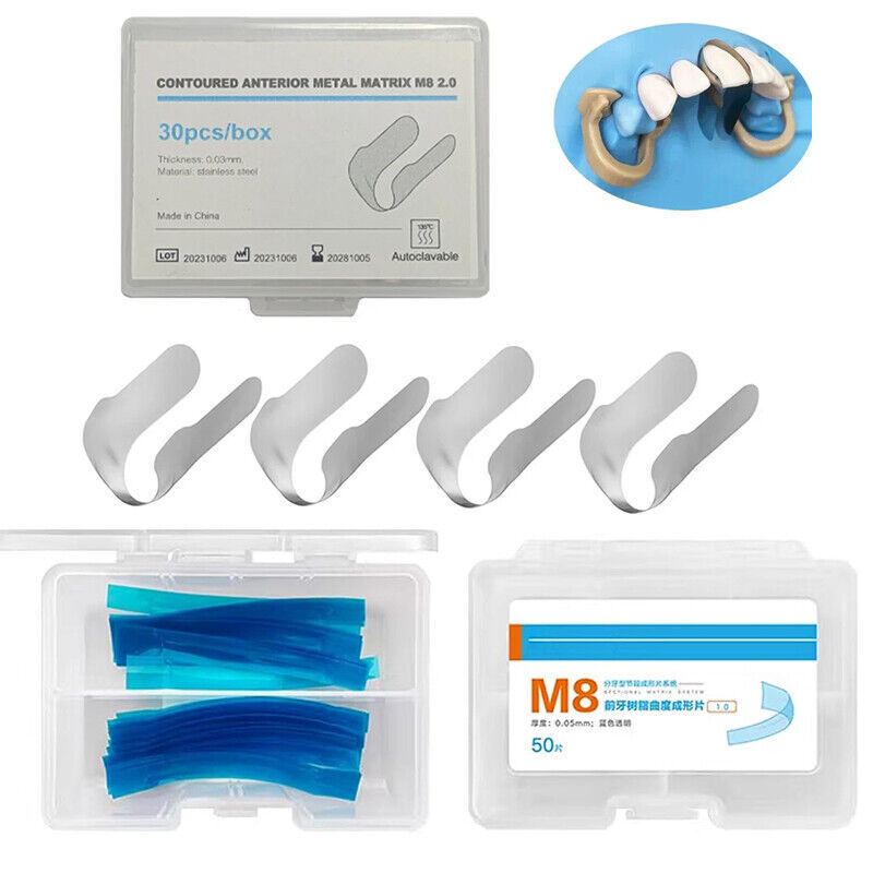 ماتریکس بند پلاستیکی قدامی - Matrix Sectional:این محصول نوار استریپ پلاستیکی آناتومیک است که به رنگ آبی شفاف به منظور کنتراست بهتر میان ماتریکس و ساختار دندان تولید شده است. از این محصول جهت بستن دیاستم برای ترمیم تمامی ترمیمهای قدامی استفاده میشود. این محصول ضخامتی در حدود 0.002 اینچی (حدود 0.05 میلیمتر) دارد. از این محصول جهت بازسازی آکلوزو- جینجیوالی استفاده میشود.ماتریکس بند پلاستیکی قدامی (Matrix Sectional) برند امریکایی گریسون با رنگ آبی شفاف در فروشگاه اینترنتی دندانت عرصه میشود.