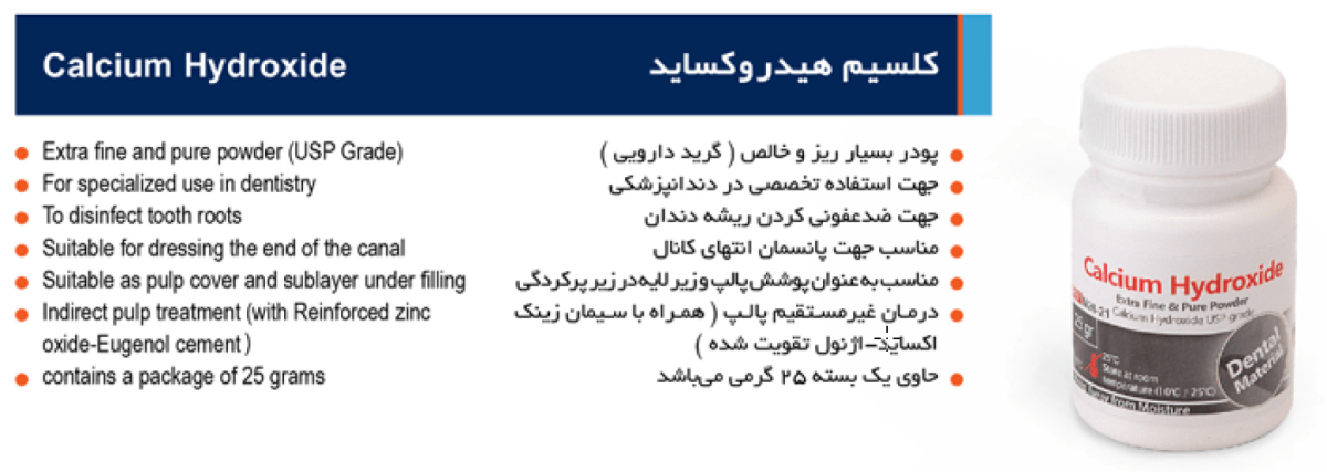 توضیحاتدرمان غیر مستقیم پالپ (همراه با سمان زینک اکساید – اوژنول تقویت شده) را انجام میدهد.جهت کفبندی در زیر پرکردگی و پانسمان داخل کانال مناسب میباشد.برای ضدعفونی کردن ریشه دندان استفاده میشودکلسيم هيدروکسايد از جمله موادی میباشد که در ترمیمهای دندانپزشکی به مانند یک لایه مستحکم عمل میکند. همچنین از این ماده میتوانید به عنوان پرکننده موقت کانال ریشه دندان در مراحل عصبکشی استفاده کنید زیرا نیاز است تا قبل از ساخت لایههای قویتر از کانال ریشه محافظت کنید و این کار با استفاده از کلسیم هیدروکساید ممکن خواهد بود. از این ماده میتوان به صورت خمیر برای درمان موارد زیر استفاده کرد:نکروزهاشکستگیهای التهابی دنداناز این ماده نه تنها در پوشش دادن کانالهای ریشه دندان، بلکه در میکروبکشی کانال نیز بسیار کاربرد دارد. از طرفی دیگر از این ماده میتوانید در بهبود هر چه سریعتر بافتها استفاده کنید چرا که به مانند یک چسب عمل میکند و رسوبات مواد معدنی در بافتها ایجاد میکند. به عبارتی میتوان گفت که این ماده یکی از واجبات دندانپزشکی میباشد چرا کهع کیفیت و سرعت کار را افزایش میدهد.پودر کلسیم هیدروکساید مروابناین محصول یک پودر بسیار ریز و خالص میباشد که برای مصارف تخصصی دندانپزشکی استفاده میشود و مزایای زیر را دارد:ضد عفونی کردن ریشه دندانپانسمان انتهای کانال دندانپوشاندن پالپ و لایه زیرین زیر پرکنندهدرمان غیر مستقیم پالپدرمان ریشه دندانبا استفاده از این محصول و آب مقطر و یا سرم فیزیولوژیکی، خمیر به وجود میآید که به خوبی کانال دندان را شستشو میدهد.بهبود سریع بافت دندانهااین محصول همچنین از قابلیت بهبود سریع بافت دندانها برخوردار میباشد و نقش چسب شیمیایی را بازی میکند و خیلی سریع کانال ریشه دندان را پر میکند. در واقع این محصول از چسبندگی بالایی برخوردار میباشد و به همین جهت رسوبات را در بافت دندان ایجاد میکند و به این صورت بافت دندان ترمیم پیدا میکند.