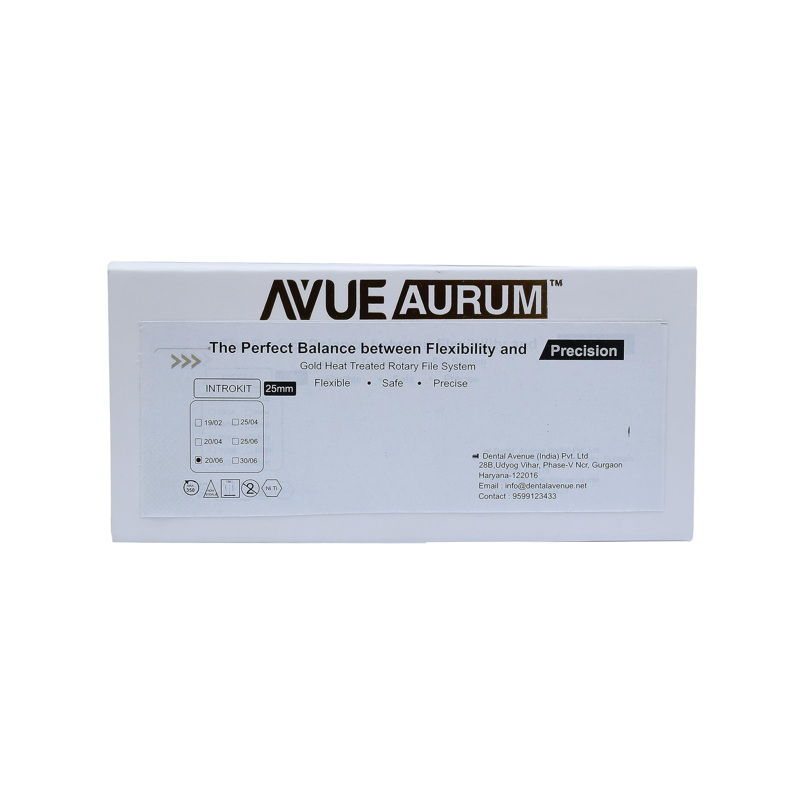 فایل روتاری 4 عددی - Aurum Blue Triangle 25%:یکی از ویژگی‌های مهم یک فایل مقاومت آن در برابر شکستن است. هرچه فایل مقاوم‌تر و از استحکام بیشتری برخوردار باشد، احتمال شکستن فایل در پروسه اندو کاهش می‌یابد. علاوه بر استحکام، انعطاف پذیری یک فایل نیز فاکتور مهم است. عملیات حرارتی انجام شده بر روی آلیاژ Niti (جهت آشنایی با این آلیاژ کلیک کنید) بهبود یافته، فایل‌های Aurum Blue و Aurum Pro را به یکی از مقاوم‌ترین و در عین حال منعطف‌ترین فایل های روتاری تبدیل کرده است.در پروسه اندو، زمانی که از دهانه کانال به سمت ناحیه اپیکالی می‌رویم نیاز به فایل سخت‌تر کاهش و در عین حال نیاز به یک فایل منعطف‌تر افزایش می‌یابد. علاوه بر این نباید از تراش نرم و صاف دیواره کانال نیز غافل شد. فایل‌های Aurum Blue با دو سطح مقطع مربعی (دو فایل اول) و مثلثی (دو فایل آخر) باعث ایجاد استحکام و سختی بیشتر در فایل های ابتدایی و ایجاد انعطاف بیشتر در دو فایل آخر شده است. سطوح الکتروپولیش شده فایل‌ها با کاهش زدودگی بقایای فلز از سطح فایل، با حفظ برندگی فایل، سطحی صیقلی به آن داده است که باعث تراش نرم دیواره کانال شده و از ایجاد میکروگپ جلوگیری می‌کند. توان عملکردی فایل‌ها در سرعت های 300 و 500 دور در دقیقه و گشتاورهای 1.5 و 2 نیوتن بر سانتی‌متر به ترتیب در فایل‌های Aurum Pro و Aurum Blue از دیگر ویژگی‌های این فایل‌ها است. طراحی Memory Shape فایل های Aurum Blue قابلیت ورود و شکل دهی به کانالهای Dilaceration را افزایش داده و فشار جانبی به دیواره کانال در حین اندو را کاهش می‌دهد که باعث حفظ شکل اصلی کانال در ناحیه اپیکالی می‌شود.