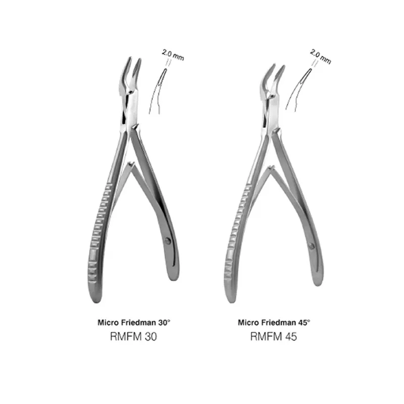 بن رانژور میکرو فریدمن - Bone Rongeur Micro Friedman:بن رانژور برای برداشتن لبههای تیز برآمدگی استخوان آلوئولار پس از کشیدن دندان استفاده میشود. در واقع بن رانژور یک ابزار جراحی است که به طور خاص برای جداسازی و کندن قطعات استخوان (ظریف تا سنگین) و بافتهای نرم اطراف آن به کار میرود. این اینسترومنت همچنین در حوزههای ارتوپدی و مغز و اعصاب نیز مورد استفاده قرار میگیرد. وجه تمایز اینسترومنتهای مدسی عدم ایجاد خط و خش و مقاومت بدنه آنهاست، به طوری که علاوه بر مقاومت زیاد در برابر ایجاد خط و خش روی محصول، به دلیل جنس استیل ضد زنگ خود نسبت به خوردگی و زنگ زندگی بسیار مقاوم هستند و میتوان به راحتی آنها را با مواد ضد عفونی کننده و یا داخل دستگاه اتوکلاو، استریل کرد.بن رانژور میکرو فریدمن از برند ایتالیایی مدسی با جنس استیل ضد زنگ و طول 145 میلیمتر در فروشگاه اینترنتی دندانت عرضه میشود.
