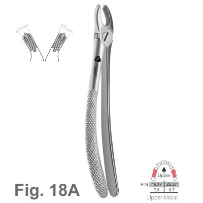 فورسپس مولر فک بالا چپ - Upper Molars Left Forceps Fig18:این فورسپس جهت کشیدن دندان های مولر فک بالا مورد استفاده قرار می گیرد.در ساخت قسمت فوقانی ظرافت خاصی دارد و لبه های بالا و پایین فورسپس دندانه دار است.مشابه نمونه های اروپایی طراحی و تولید شده است.طول فورسپس 17 سانتی متر و طول کاربردی آن 2 سانتی متر است.فورسپس مولر فک بالا چپ برند دنتال دیوایسبا جنس استیل عرضه می گردد.**** خریدفورسپسبا بهترین قیمت کلیک کنید ******** خرید بهترینابزار دندانپزشکیبا کیفیتی تضمینی تنها در دندانت ****