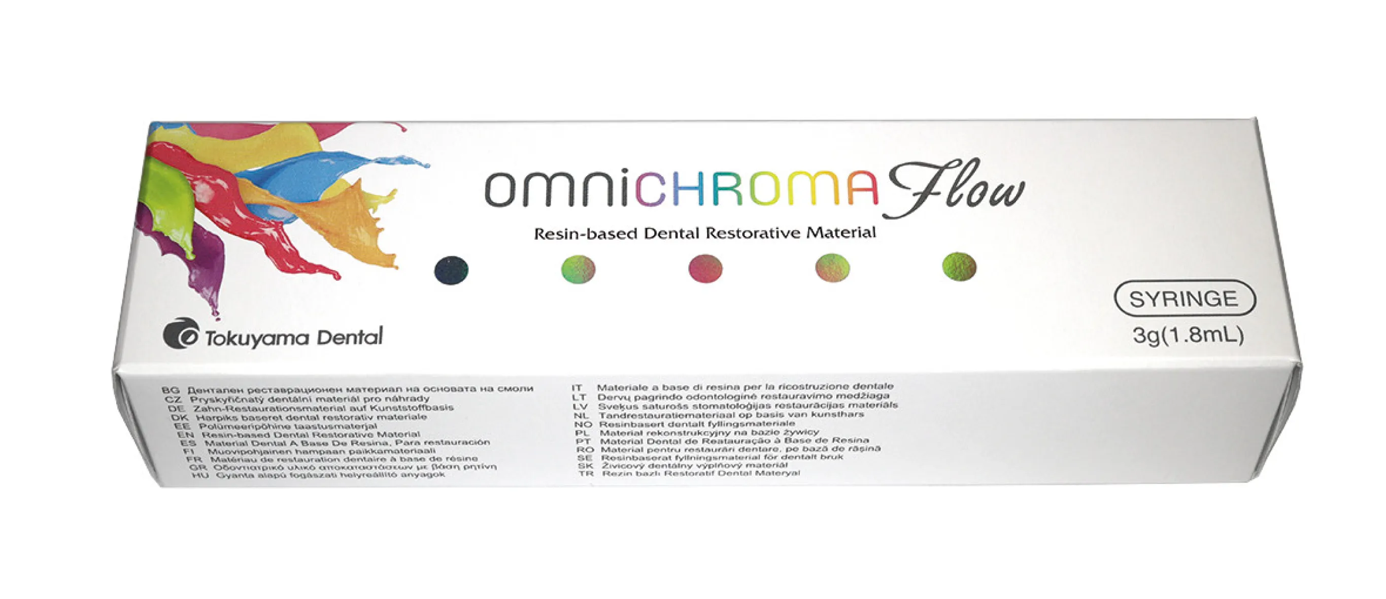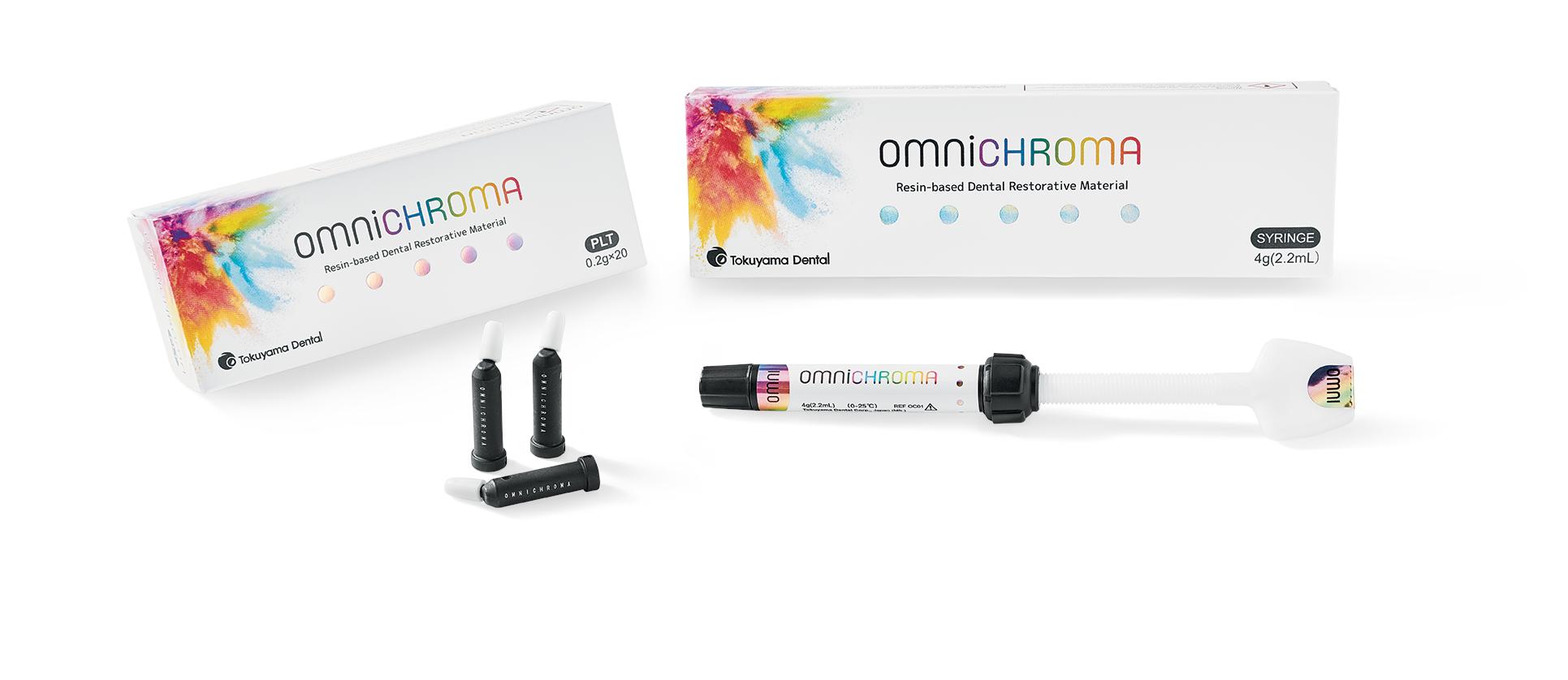 توضیحاتمزایا استفاده از کامپوزیت omnichromaتمام رنگ های دندان را می تواند ساپورت کند بجز برای استفاده به عنوان کامپوزیت ونیر (کامپوزیت با رنگ های خیلی روشن )میزان و نحوه جذب و انعکاس نور ها باعث تطابق کامپوزیت دندان میشودروش های SOL-GEL : کور در حلالی آلی و رسیدن به نقطه 260 نانومتر زمان واکنش میزان بزرگی فیلر را تعیین می کندروش های SOL-GEL : ضریب شکست فیلر با رزین آلیمیزان فیلر 260 نانومتر و از سلیکا و زیرکونیا تشکیل شده استمونومر UDMA/TEGDMA میزان فیلر 68% حجمی و 79% وزنیدارای بالابردن استحکاممناسب ترمیم کلاس I و II معمولی و III و Vترمیم های کلاس IV و II با تخریب بالا حتما باید از بلاکر استفاده شودتنظیم رنگ با کامپوزیت های معمولیدر حال حاضر همه ی کامپوزیت های یونیور سال موجود در بازار برای تطبیق رنگ دندان تمام بیماران، رنگ های متعددی ارائه می دهند.اولین کامپوزیت یونیورسالی که فقط یک رنگ برای تطبیق در هر بیمار و تقریبا هر کیسی ارائه می دهد. کامپوزیت اومنی کروما ساخت توکویاما میباشد.