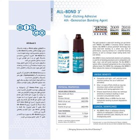 All-Bond 3 A&B SET – آل باند 3 بیسکو باندینگنسل چهارم محسوب میشود. وجود اتانول در این محصول باعث شده تا تعداد لایههای لازم برای باندینگ کاهش یابد. همچنین از دیگر خواص آل باند 3 بیسکو، خواص هیدروفوبیک آن است که منجر به افزایش طول عمر باندینگ میشود. نظرات خود درباره محصول آل باند 3 بیسکو را با ما در میان بگذارید.قدرت باندینگ آل باند 3 بیسکو چقدر است؟آل باند 3 بیسکو در دو بطری 6 میلیلیتری A و B به فروش میرسد. این محصول قدرت باندینگ بسیار فوقالعادهای دارد. قدرت باندینگ این محصول به صورت زیر است:Dentin (Ultradent Method): 45(8) MPaDentin (#5 gel cap): 26(2) MPaEnamel (#5 gel cap): 28(2) Mpaخواص و ویژگیهای آل باند 3 بیسکومحصول آل باند 3 بیسکو با فرمول جدید حاوی اتانول، ویژگیهای زیادی دارد که عبارتند از:هندلینگ آسانکاهش تعداد لایهها در باندینگخاصیت آبگریزیکمک به افزایش طول عمر باندینگکاربرد بسیار آسانباندینگ قوی با کلیه مواد ترمیمی اعم از سلف کیور، لایت کیور و دوال کیوربرقراری ارتباط میکرومکانیکال فوق العاده قوی با مواد ترمیمیقابل استفاده برای تمام انواع باندینگبرای مشاهده قیمت وخرید باندینگ دندانپزشکیبه وبسایتفروش مواد دندانپزشکی دنتیوامراجعه کرده و محصول مدنظر خود را با تضمین اصالت کالا خریداری نمایید.