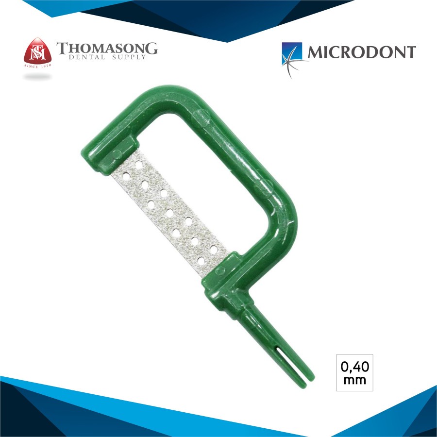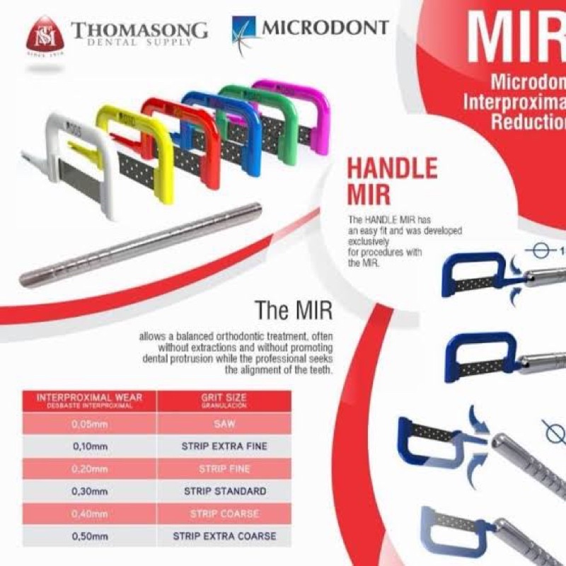 اره بین دندانی - Interproximal Reduction SAW-MIR:قابلیت برداشتن مواد ترمیمی در ناحیه بین دندانی بدون آسیب رسانی به ترمیم را دارد.کانتکت بسیار مناسب با توجه به ضخامت کم نوار (حدود 5 میکرون) ایجاد می کند.بدون نیاز به دسته یا ابزار خاص، قابل استفاده با دست است.قابل استریلیزاسیون در اتوکلاو (در دمای 135C) است.اره بین دندانی برند میکرودنتدر بسته های تک عددی عرضه می گردد.