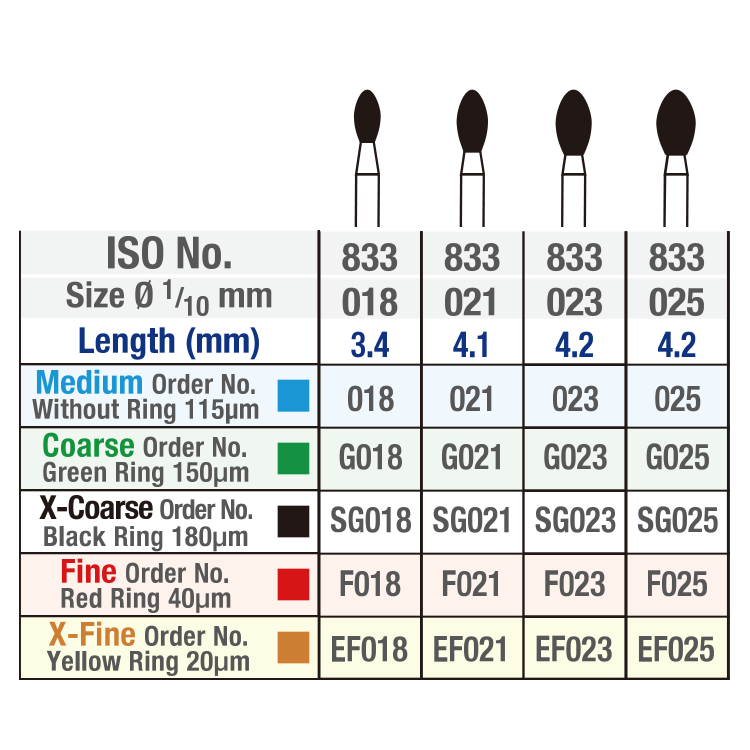 فرز الماسی مدل تخم مرغی توربین - Dental Diamond Burs Egg 833:این فرز در تخلیه پرکردگیهای قدیمی و آماده سازی تاج دندان جهت روکش مورد استفاده قرار میگیرد.برای شکل دادن و تکمیل تراش قابل استفاده است.فرز الماسی شماره 833 برند دندیادر رنگ های سبز، آبی، قرمز و سایز سر فرز 023 و در بسته بندی 5 عددی عرضه میگردد.