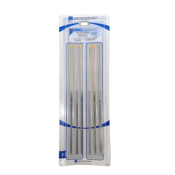 نوار پرداخت استیل الماسه با مرکز اره - Stainless Steel Diamond Saw Blades Strips:این محصول نوار پرداخت استیل الماسه با مرکز اره است کهطراحی دندانههای ارهای در مرکز به منظور برش سخت دارد و نوار استیل تقویت شده با الماس به منظور پرداخت نواحی بین دندانی از دیگر ویژگی ساختاری آن است.نوار پرداخت برندمیکرودونتساختبرزیلدر سه درجه سختی رنگ زرد -نرم (Fine)- رنگ آبی -متوسط (Medium)- رنگ سبز -زبر (Coarse) در بستههای 6 عددیعرضه شده است