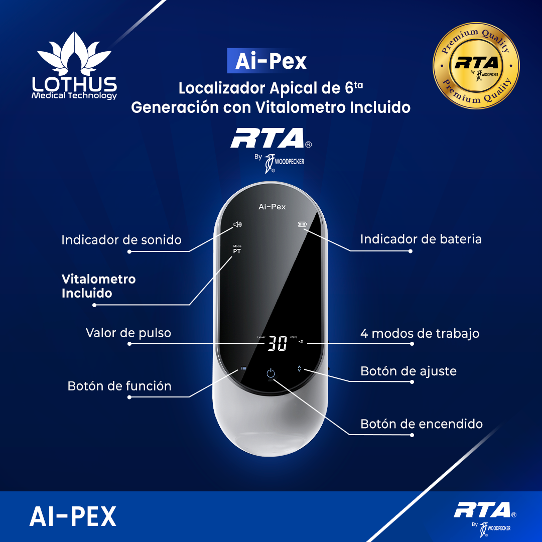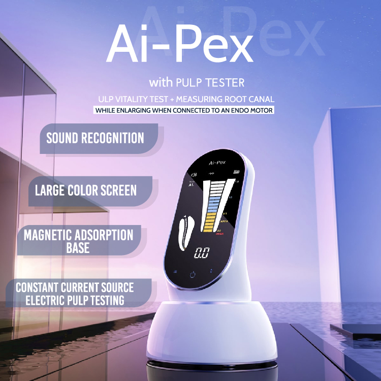 توضیحاتاپکس فایندر و پالپ تستر Woodpecker مدل Ai-Pexیکی از دستگاه های کاربردی و با کیفیت می باشد که در کشور چین و توسط شرکت وودپکر طراحی و تولید شده است.از این دستگاه هم به عنوان اپکس فایندر جهت تعیین طول کانال و هم بعنوان پالپ تستر به منظور تست زنده بودن پالپ دندان استفاده می شود.صفحه نمایش اپکس فایندر و پالپ تستر Ai-Pex وودپیکراین محصول دارای LCD رنگی 3.8 اینچ بوده که تصاویری کاملا واضح و روشن را در اختیار شما قرار می دهد. همچنین قابلیت کار در محیط های خشک، مرطوب، مملو از پالپ ،آرسی پروب ، خونی و عفونی را دارا می باشد.دقت اندازه گیریاین دستگاه از دقت اندازه گیری بسیار دقیق برخوردار است به طوری که می توان گفت 2.125 برابر دقیق تر از دقیق ترین رقیب خود می باشد. همچنین دارای درصد خطای بسیار پایینی است که این میزان به کمتر از 2 درصد می رسد. وجود سیستم هشدار اندازه گیری غلط موجب می شود که میزان خطا حین کار بسیار کاهش پیدا کند.