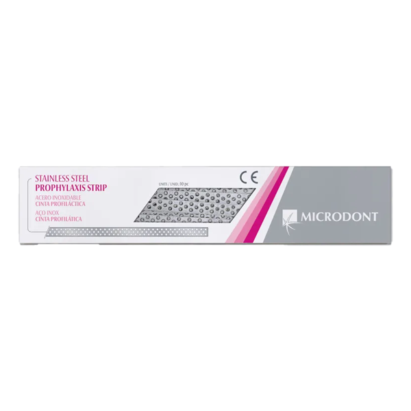 نوار پرداخت غیرساینده پروفیلاکسی - Stainless Steel Prophylaxis Strip:نوار پرداخت غیرساینده پروفیلاکسی برند میکرودونت مخصوص پالیش دندانی و حذف لکهها و پلاکهای مقاوم است. این محصول برای پاکسازی بین دندانی؛ پالیش نهایی و زیبایی کاربرد دارد. همچنین این نوارها از استیل ضدزنگ، بدون ساینده، ضخامت نازک، انعطافپذیری بالا هستند که برای قرارگیری راحت بین فضاهای بین دندانی بدون آسیب به مینا یا لثه مورد استفاده قرار میگیرد.نوار پرداخت غیرساینده پروفیلاکسی از برند میکرودونت ساخت برزیل با عرض 4 میلیمتر و طول 15 سانتیمتر در بستههای 10 عددی در فروشگاه اینترنتی دندانت عرضه میشود.