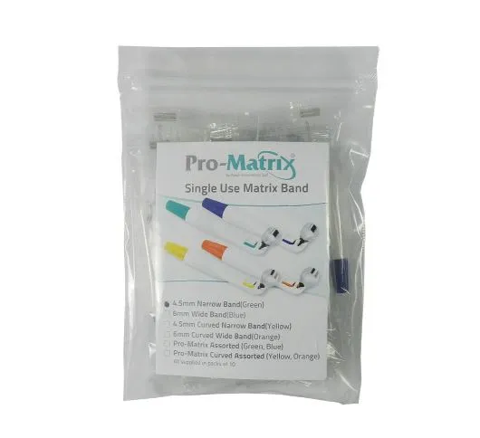 نوار ماتریکس لوپدار - Adult Mod Narrow Matrix Band:این نوار ماتریکس برایجایگزینی دیوارههای کناری از دست رفته دندان و متراکم کردن مواد ترمیمی در حفرههای کلاس به کار میرود به این معنی کهدور تاج دندان بسته میشود تا مواد ترمیمی را محدود کند تا در یک حفره آماده تطبیق دادن شوند. نوار ماتریکسهای هانینکرات بسیار باریک هستند و مقاومت کششی بسیار مناسبی دارند. از سایر ویژگیهای این محصول جنس استیل ضد زنگ آن است که باعث میشود بتوان بدون نگرانی بابت زنگ زدگی و یا خوردگی به صورت ایمن این محصول را داخل دستگاه اتوکلاو قرار داد و یا با مواد ضدعفونی کننده استریل کرد.نوار ماتریکس لوپدار (Adult Mod Narrow Matrix Band) از برند AKO در بستههای 144 عددی در فروشگاه اینترنتی دندانت عرضه میشود.