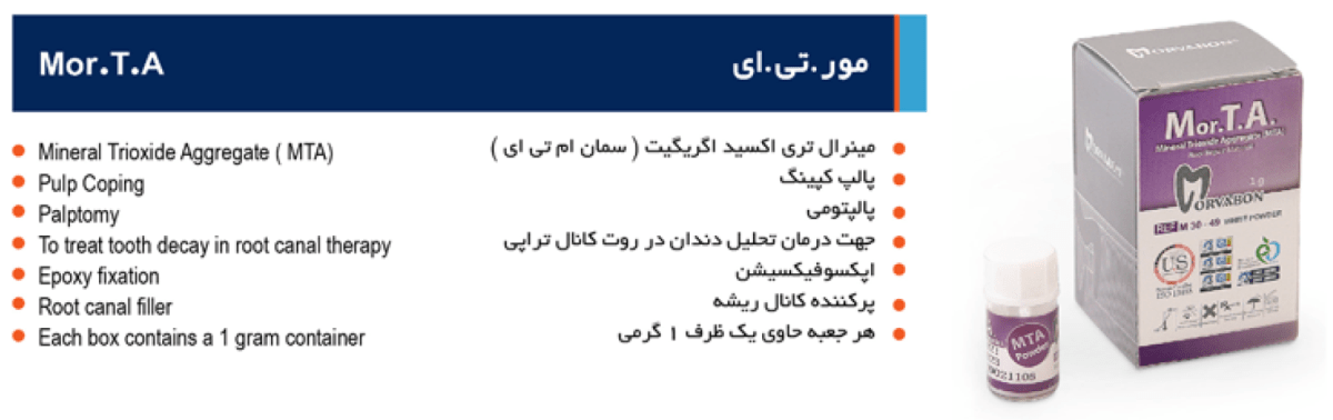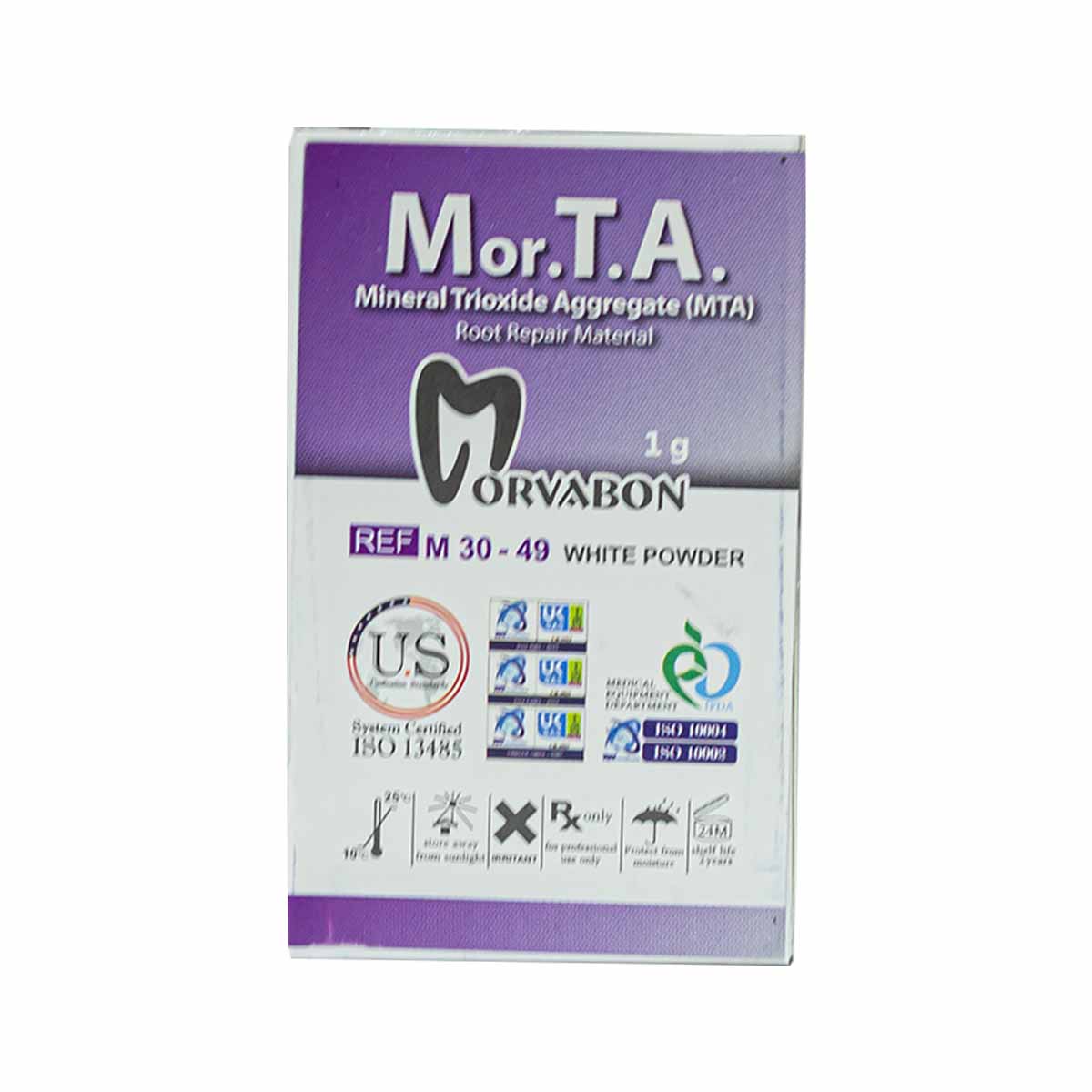 توضیحاتمعرفی و خرید پودر اِم تی اِیMTA Cement-:بافتهای سخت را دوباره بازسازی و کانال دندان را محکم میکند.این ماده میتواند به عنوان ماده پرکننده کانال ریشه و پالپ کپینگ استفاده شود.پودر اِم تی اِی مروابن زیست سازگار بوده است و حداقل واکنش التهابی را ایجاد میکند.خاصیت ضد باکتریایی دارد. جهت درمان تحلیل ریشه در روت کانال تراپی استفاده میشود.دارای ترکیبات اکسیدهای معدنی، سیلیکاتهای کلسیم، عامل رادیواپک و اصلاح کنندههای فیزیکی و شیمیایی میباشد.MTA سمانی اندودنتیک جهت درمان ریشه میباشد که با انتشار یون کلسیم و افزایش بافت معدنی، موجب ترمیم کانال ریشه میشود.این محصول در پالپوتومی دندانهای شیری، پوشش مستقیم پالپ، پوشش غیرمستقیم پالپ، درمان پالپ زنده، بستن پرفوریشن دندانها، درمان دندانهای با ایکس باز (زنده و غیرزنده) و جراحیهای پریاپیکال ریشه کاربرد دارد.پودر اِم تی اِی مروابن در وزن 1 گرم عرضه میگردد.**می توانید از کد تخفیف برای خرید این محصول استفاده کنید.