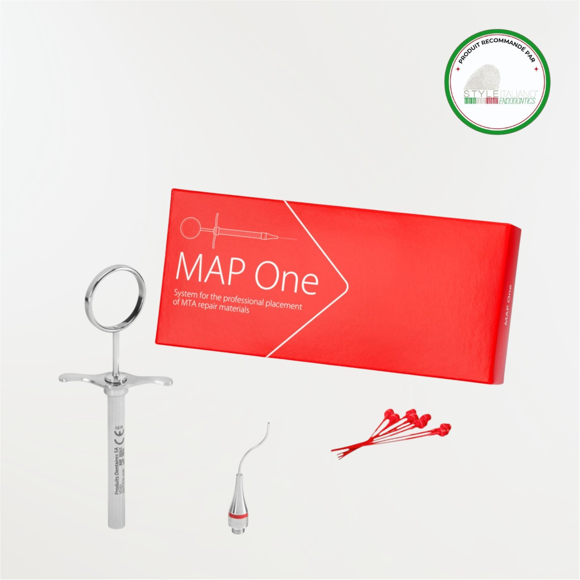 ام تی ای کریر - Map One:این محصول برای انتقال MTA و دیگر مواد ترمیمی اندو مورد استفاده قرار میگیرد. از ویژگیهای آن میتوان به طراحی ارگونومیک و سبک وزن بودن آن اشاره کرد. همچنین جنس این سرنگ از استیل ضد زنگ و جنس سری آن از تیتانیوم منعطف و بادوام است. سری آن صاف و به اصطلاح تک سر با قطر 1.10 میلیمتر است.ام تی ای کریر - Map One از برند PD Dental ساخت سوئیس در بستههای حاوی یک عدد سرنگ، یک عدد سری سایز یک با قطر 1.10 میلیمتر، یک عدد کورت تمیزکننده سری و هشت عدد پلانگر پلاستیکیدر فروشگاه اینترنتی دندانت عرضه میشود.