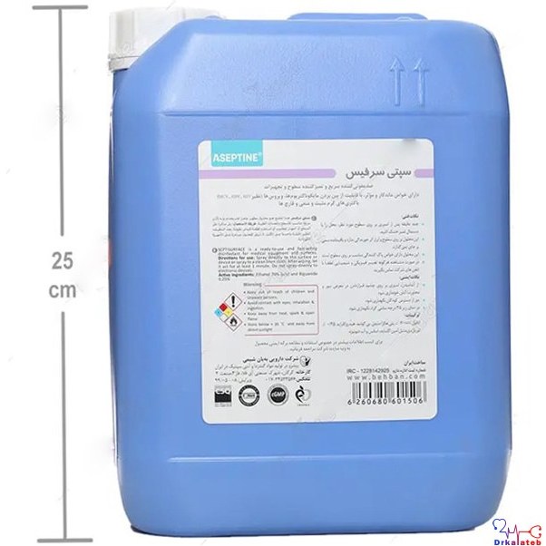 محلول ضدعفونی کننده سطوح 5 لیتری - Septisurface Plus:محصولی است که با بهرهگیری از سه نوع ضدعفونی کننده قدرتمند، قادر به از بین بردن طیف وسیعی از باکتریهای گرم مثبت، گرم منفی، ویروسها و قارچها میباشد.از ویژگیهای برجسته این محصول، پایداری و اثرات ماندگار آن در محل استفاده شده میباشد.سپتی سرفیس پلاس علاوه بر خاصیت ضدعفونی کنندگی، قادر به رفع لکههای روی سطوح میباشد.این محلول در سطوح حاوی خون و بافتهای پروتئینی قادر به ادامه فعالیت است.از محلول ضدعفونی کننده سپتی سرفیس پلاس میتوان برای ضدعفونی کردن سطوح در اماکن عمومی و بهداشتی شامل بیمارستانها،آزمایشگاهها، کلینیکها، آرایشگاهها، سالنهای ورزشی، هتلها، رستورانها، سرویسهای بهداشتی، میزکار، لوازم منزل و محل کار، واگنهای مترو، قطار و اتوبوسها استفاده کرد.محلول ضدعفونی کننده سطوح برند آسپتینبا ترکیبات اتانول، پلی هگزا متیلن بی گوانید هیدروکلراید، دی دسیل دی متیل آمونیوم کلراید و در بسته بندی 5 لیتری عرضه میگردد.نحوه مصرف:محلول سپتی سرفیس پلاس، آماده مصرف است و نیازی به رقیق کردن ندارد.مقدار مناسبی از محلول را روی سطوح آلوده اسپری کرده و اجازه دهید خشک شود.این محلول در مدت 1 تا 2 دقیقه فعالیت ضد میکروبی خود را اعمال میکند.برای کسب نتیجه بهتر، قبل از استفاده از محلول، سطح مورد نظر را تمیز و خشک کنید.