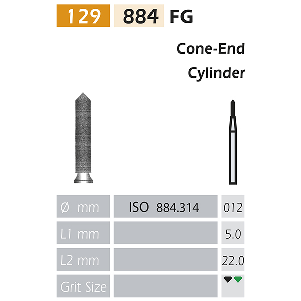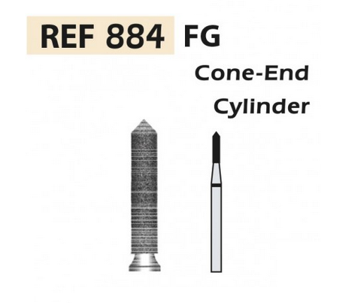 فرز الماسی توربین - Pointed cylinder 884:فرزهای الماسی محصولی از کمپانیلاستردنتو ساخته شده بامتریال فرانسویهستند. فرزکد 884 با نوار سبز رنگ و مدل Caorse درجه سختی 151 میکرومتردر قطرهای012C، 014Cدر بستههای 5 عددی درفروشگاه اینترنتی دندانتعرضه میشود.