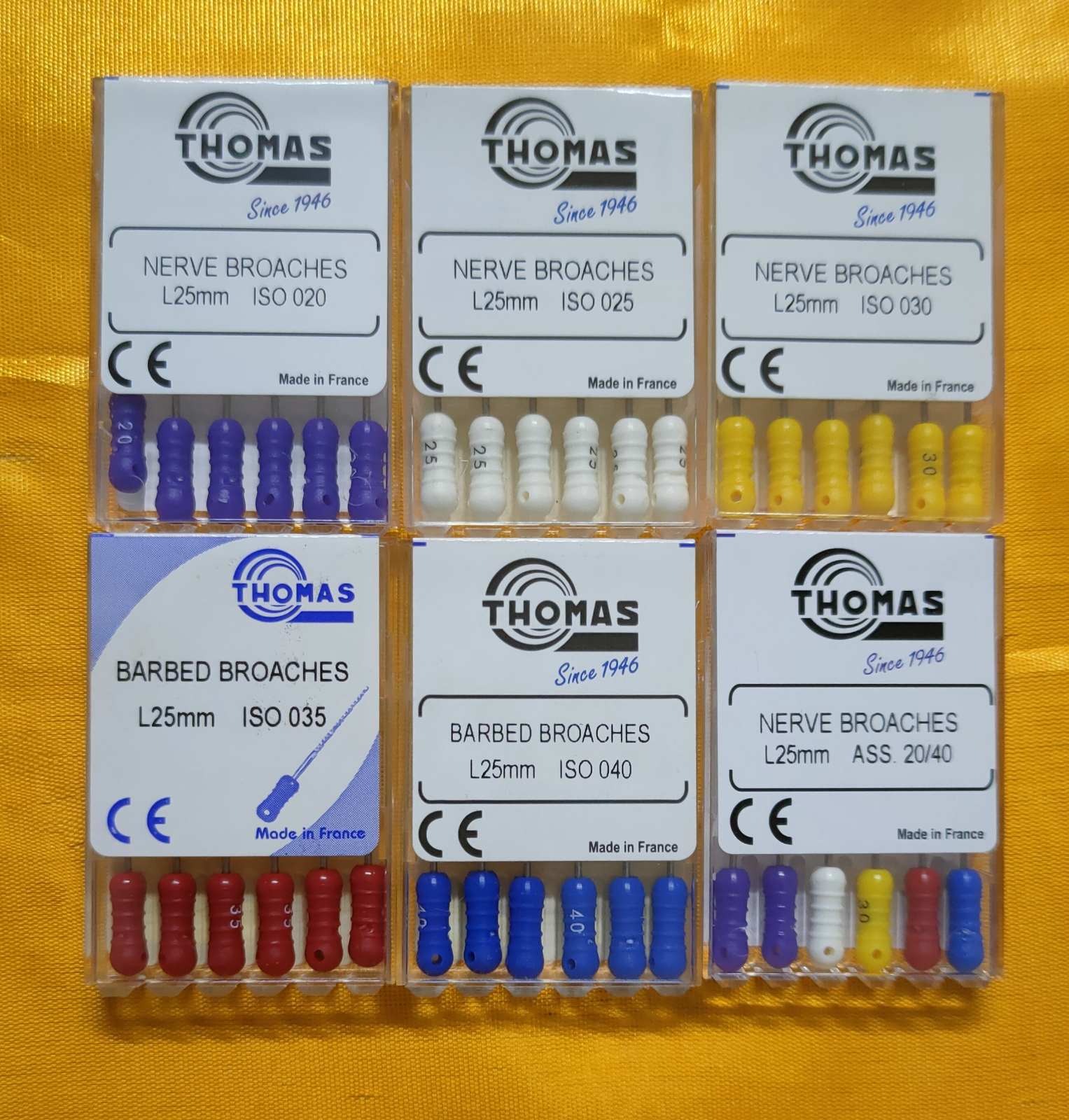 کاتالوگ محصولمعرفی و خرید باربروچ طول 25 – Barbed Broaches:جهت تمیز کردن کانال پس از عصبکشی استفاده میشود.بدنه خاردار آن باعث چسبیدن موائد زائد به آن و کمک به خارج نمودن آنها میشود.باربروچ طول 25 برند توماسبا سایزهای 20، 25، 30، 35، 40 و آسورت در بستهبندی 6 عددی عرضه میگردد.اشتراک گذاری