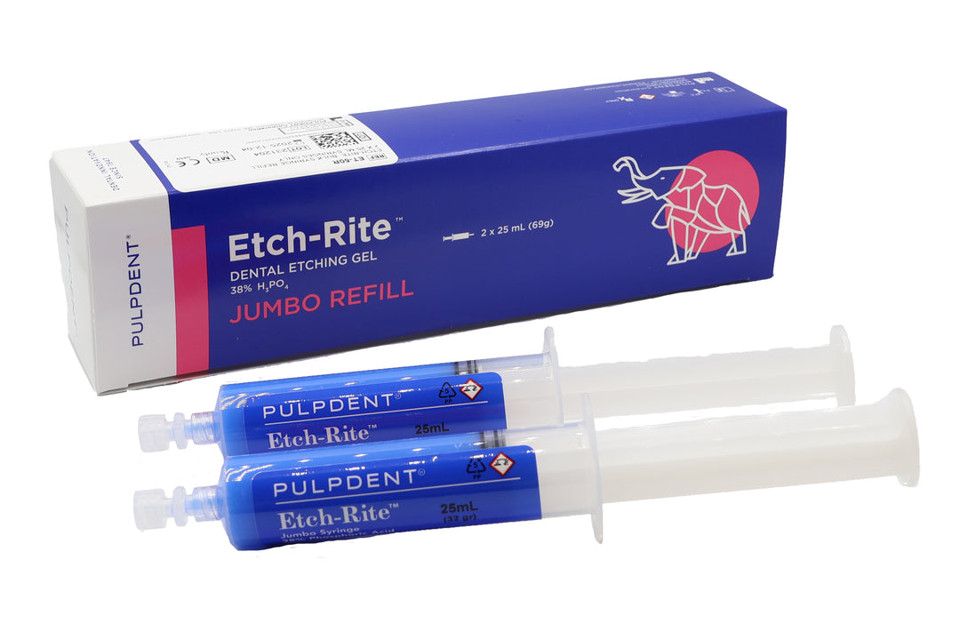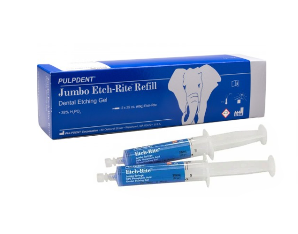 توضیحاتاسید اچ جامبو ٪38 – Jumbo Etch-Rite kit:یک ژل اچینگ با کیفیت عالی میباشد که جهت اچ کردن دندان و ایجاد محیط مناسب برای چسبندگی به کار میرود تا از ریز نشتها و ایجاد پوسیدگی دندانها جلوگیری کند.از ویژگیهای این محصول میتوان به قوام مناسب، عدم سیالیت مشکلساز و شستشوی آسان با آب اشاره کرد.دارای ویسکوزیتهی مناسب برای افزایش دقت کار و اسید فسفریک 38 ٪ میباشد.این اسید اچ جامبو رنگ آبی دارد و عالی دیده میشود.حجم این محصول 50 میلیلیتر است.اسید اچ جامبو ٪38 پالپ دنت به صورت 2 عدد سرنگ 25 میلیلیتری به همراه 5 عدد سرنگ 3 میلیلیتری خالی عرضه میگردد.